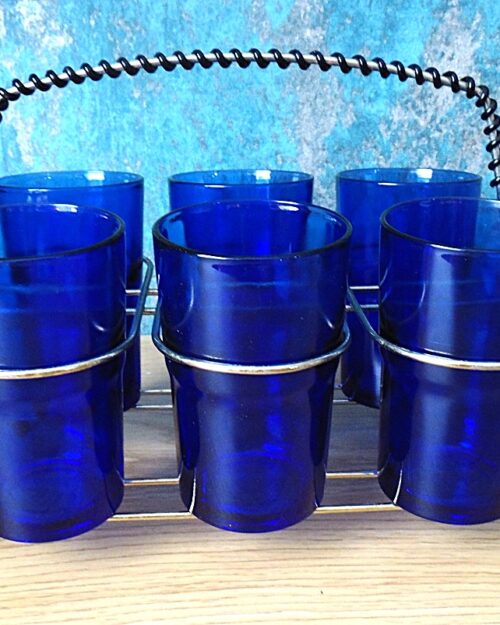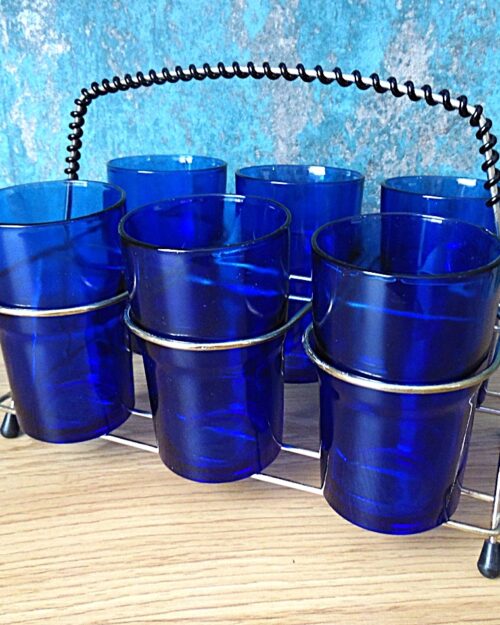 A set of 6 vintage Santa Marina Cobalt Blue Vidro Resistente glasses with rack