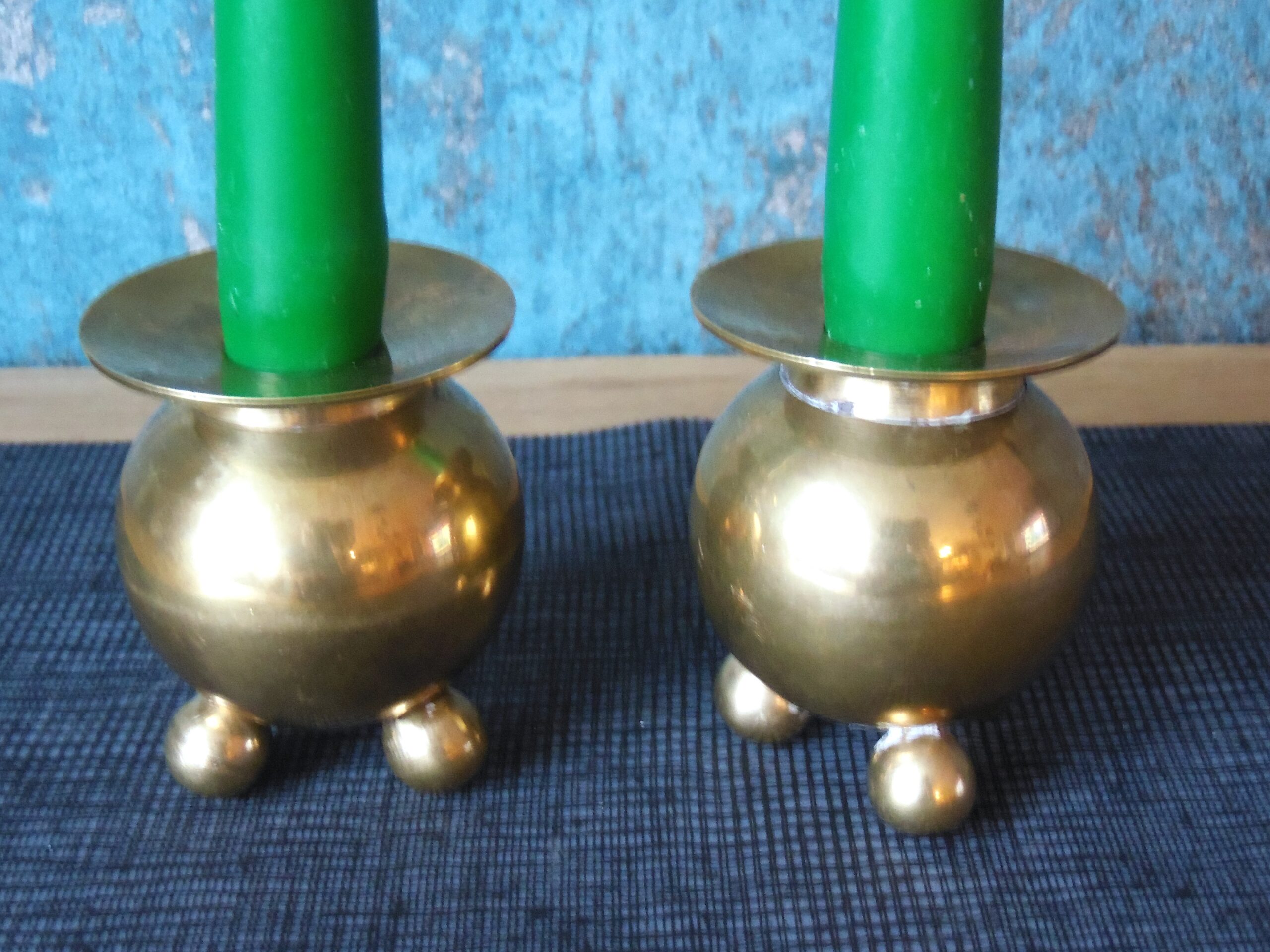 Paar väiksemaid ümmargusi vintage vaskküünlajalgu, kõrgus 7,4 cm, läbimõõt 6 cm; Küünlad ei ole oksjoni osa ja ei tule ostuga kaasa!