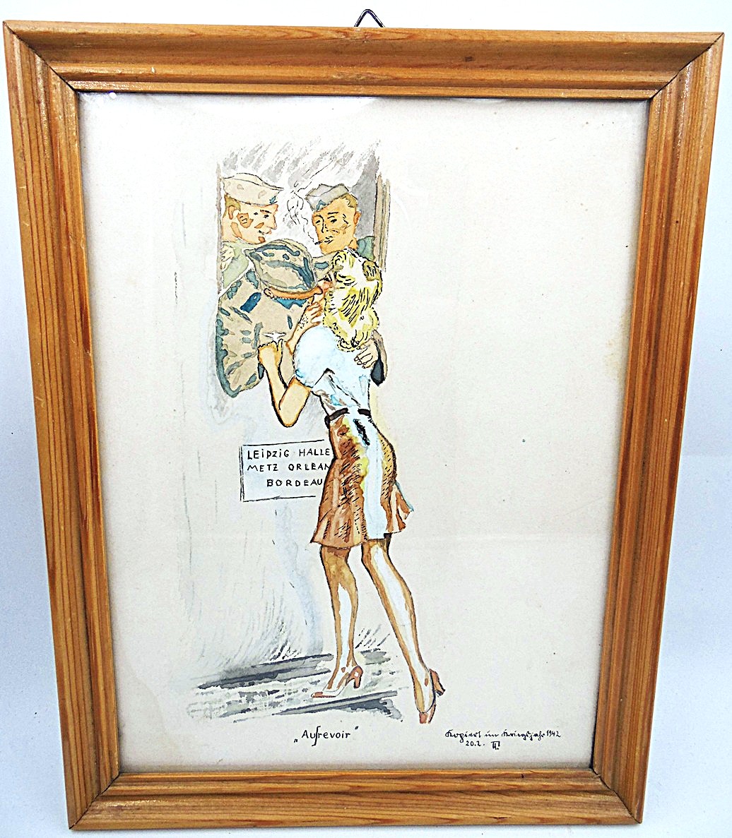Teise maailmasõja aegne akvarell, raamitud ja klaasitud, kujutab Saksa sõdurit koos prantsuse naisega läänerindel, signeeritud 1942, autor teadmata, suurus 24,8 x 19,3 cm koos raamiga, väga heas seisukorras, originaal;