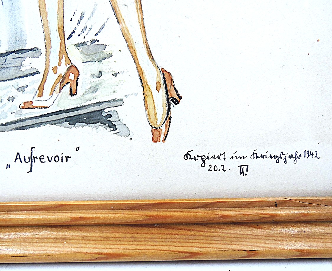 A watercolor from World War II, framed and glazed, depicting a German soldier with a French woman on the western front, signed 1942, author unknown, size 24,8 x 19,3 cm with frame, in very good condition, original;