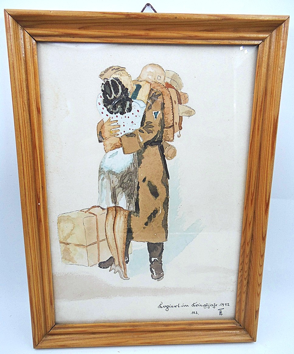 Teise maailmasõja aegne akvarell, raamitud ja klaasitud, kujutab Saksa sõdurit koos prantsuse naisega läänerindel, signeeritud 1942, autor teadmata, suurus 23,2 x 17,2 cm koos raamiga, väga heas seisukorras, originaal;