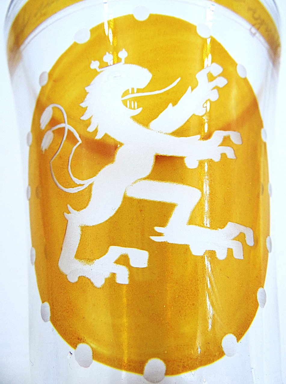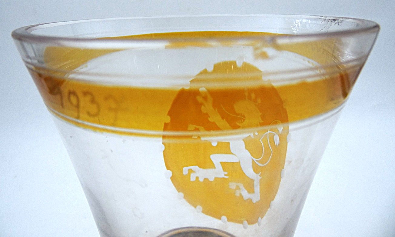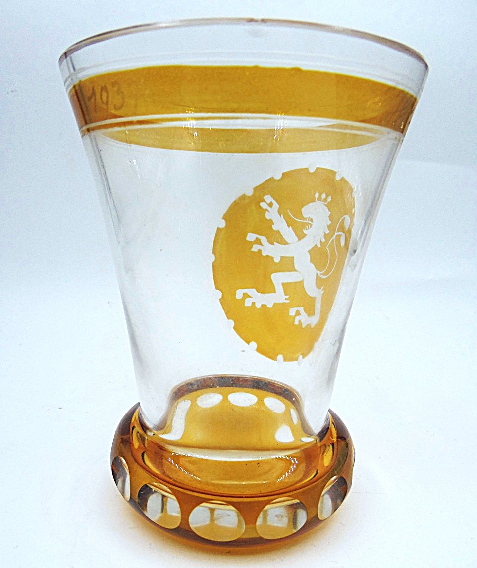 Donation glass for the German population in the Sudetenland, glass cup from 1937, manufacturer “GL Stein-Schönau” (today Kamenicky Senov in the Czech Republic), measurements height 11cm, diameter from the top 8.5cm, with two small rim damages, otherwise in good condition, original;
