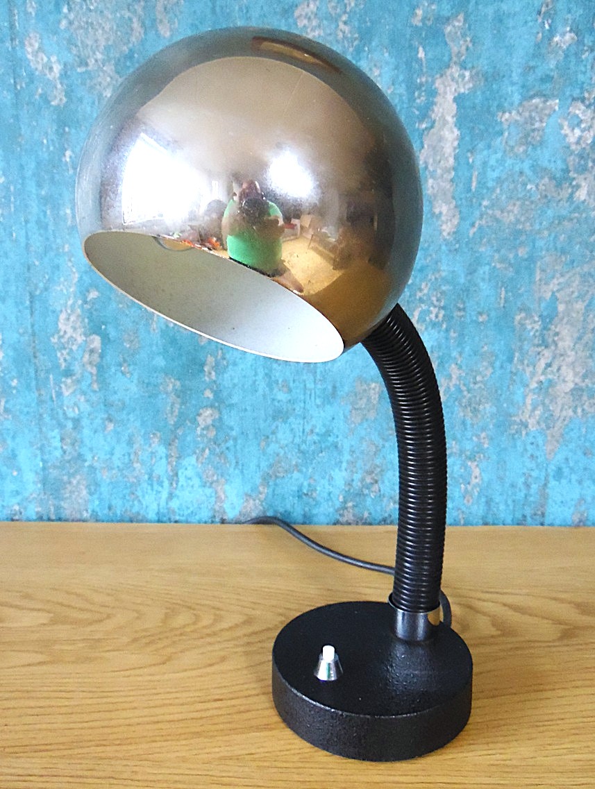 Tõeline kosmose ajastu vintage pärl lauale või disaini kogujale originaal Hillebrandi laualamp mudel 7011 – 111, 1970’st aastatest, valmistatud Saksamaal. Kroomitud pallikujulise kupli, painduva ‘’hanekaela’’ ja tugeva metallist alusega millel lüliti. Töötab ideaalselt kuid esineb eelnevast kasutusest tulenevaid jälgi ja kriime;