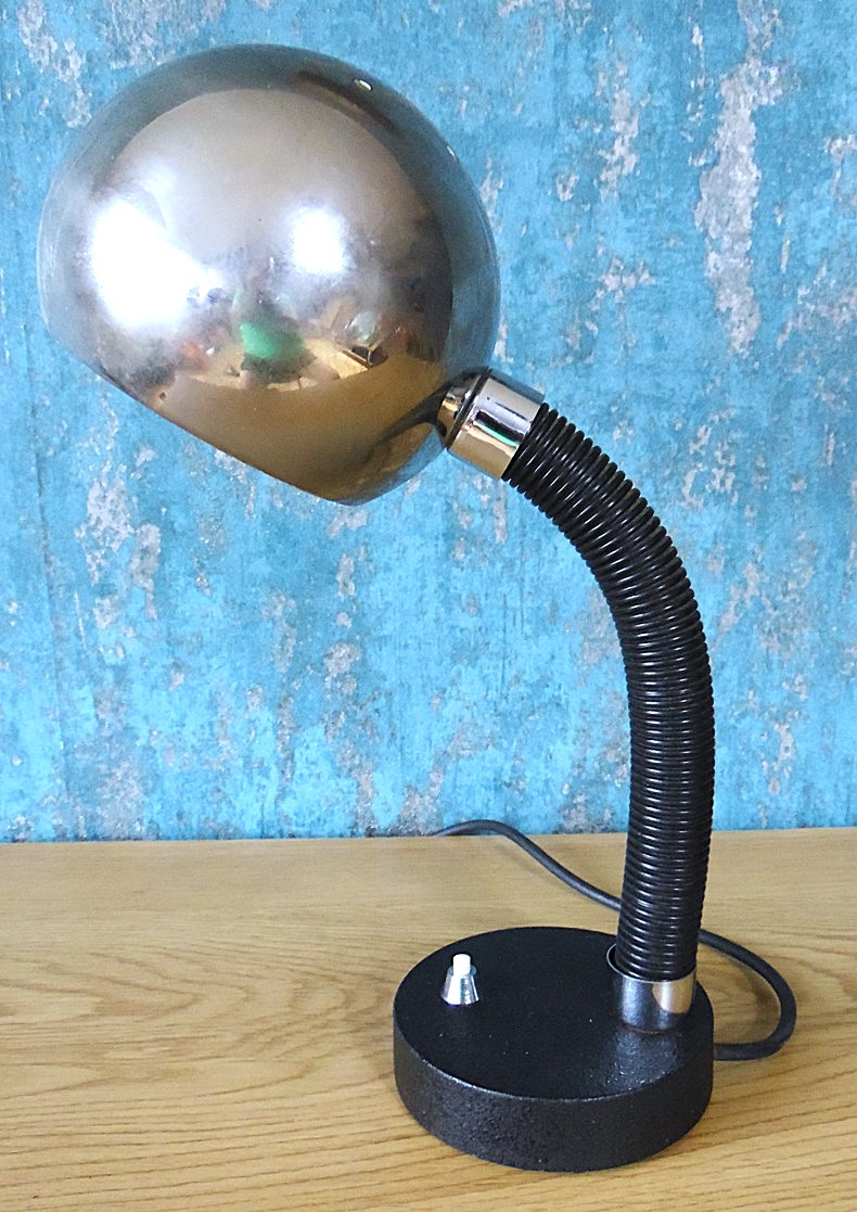 Vintage Space Age classic from Germany for a desk or design collection an Original Hillebrand table lamp model 7011-111, from the 1970’s. With a chrome-plated ball head, flexible gooseneck, and heavy cast iron base with a toggle switch. Works perfectly, with signs of previous use;