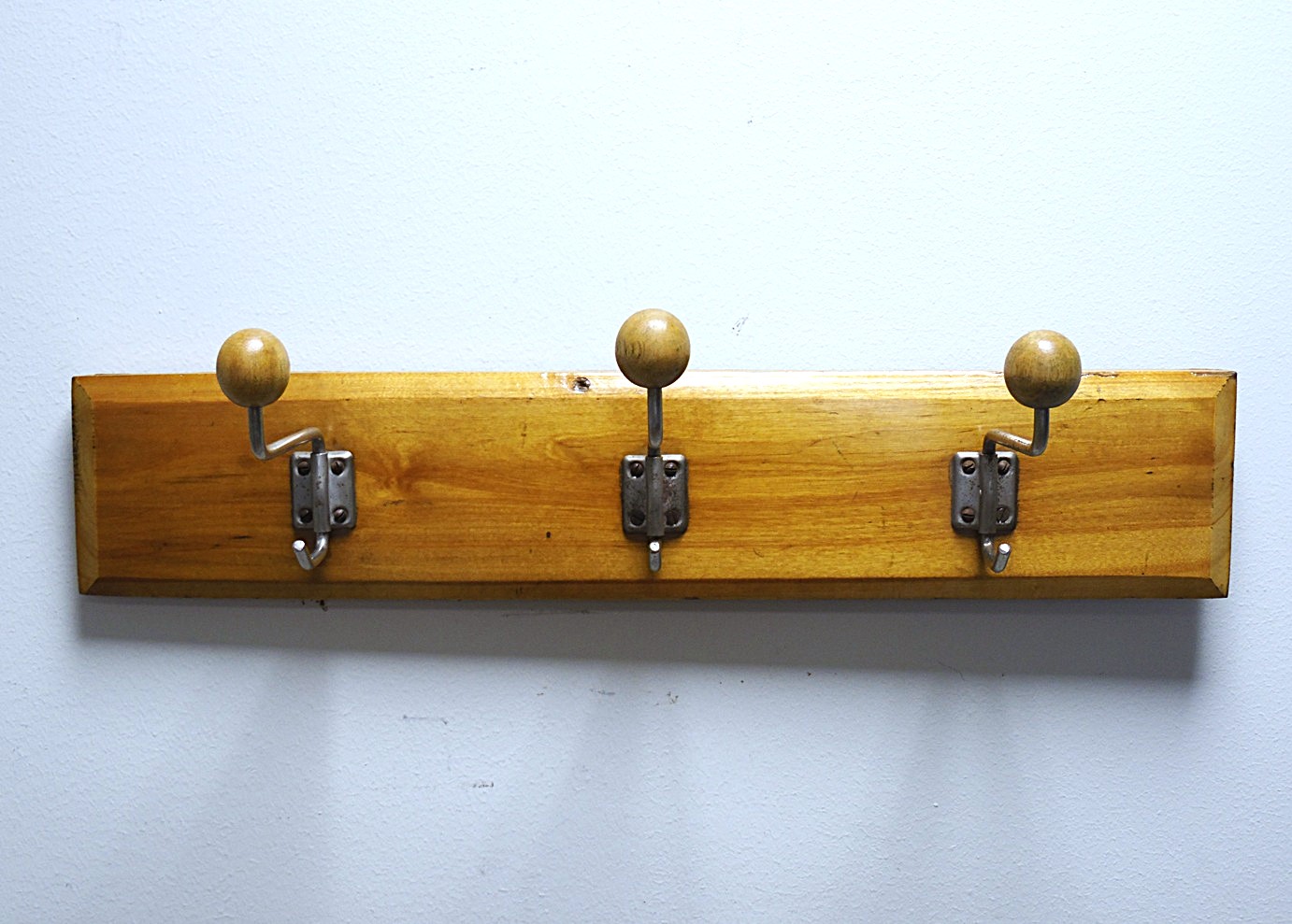 Mid-century Vintage 3-hook wooden rack, made in the 1960’s in the Soviet Union at the Tartu Furniture Factory, width 50,8 cm, height 12,3 cm, depth 15,7 cm, scratches and signs of use;