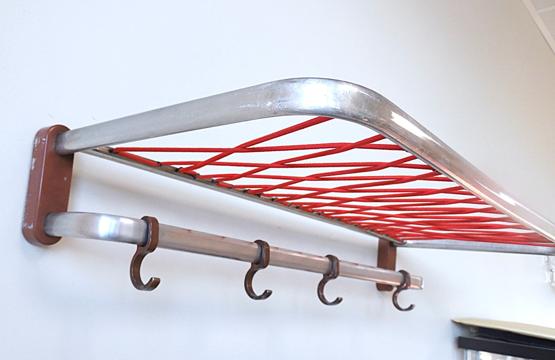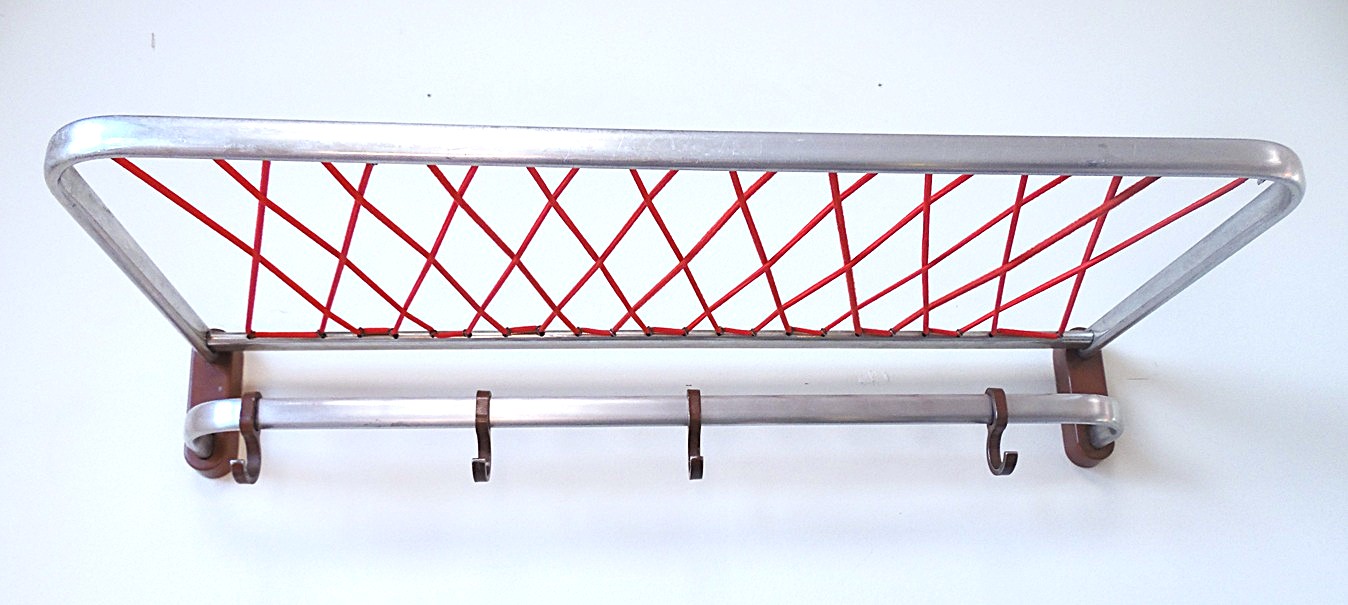 Vana vintage nelja konksuga kübarariiul 1950. aastate Nõukogude bussist, alumiiniumist raam, laius 64,5 cm, kõrgus 12,7 cm, sügavus 28,5 cm, kriimustuste ja kasutusjälgedega, sobib ideaalselt ruumikujundus elemendina väiksemasse esikusse;
