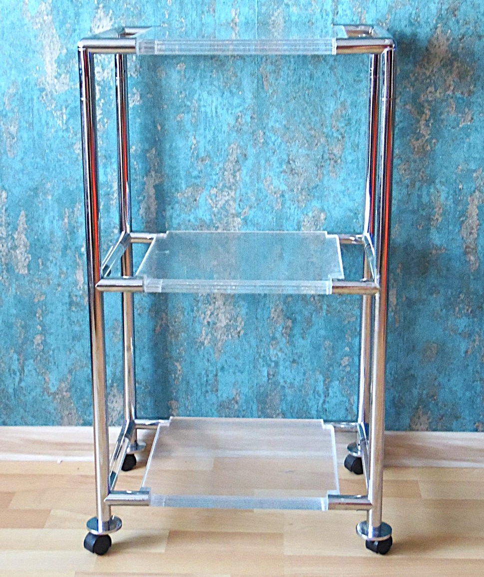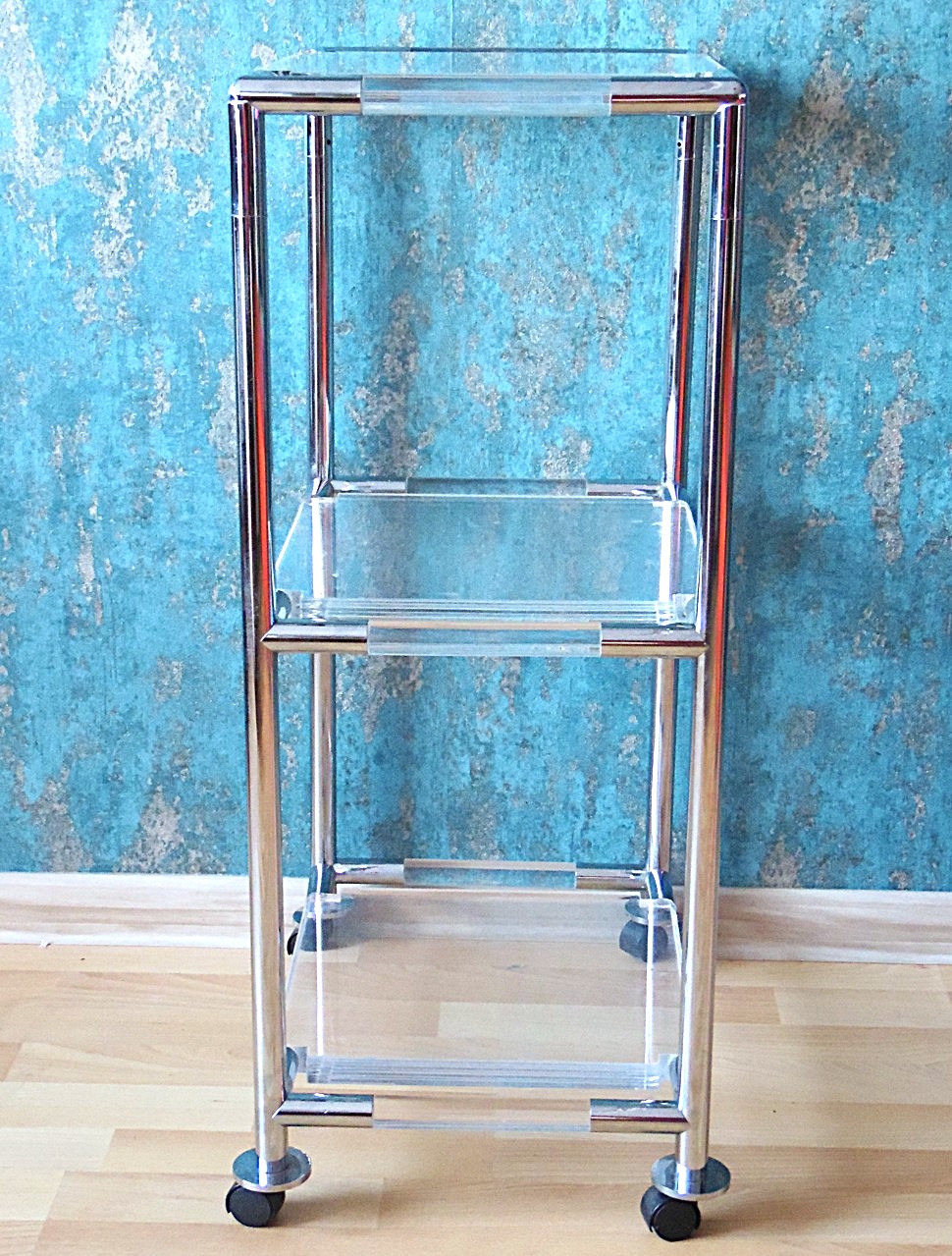 Mid Century Vintage Italian serving/console table, from the 1970’s, made of thick plexiglass and chrome-plated pipes, classic Charles Hollies-Jones style item, dimensions: height 75 cm, width 42 cm, depth 30 cm;