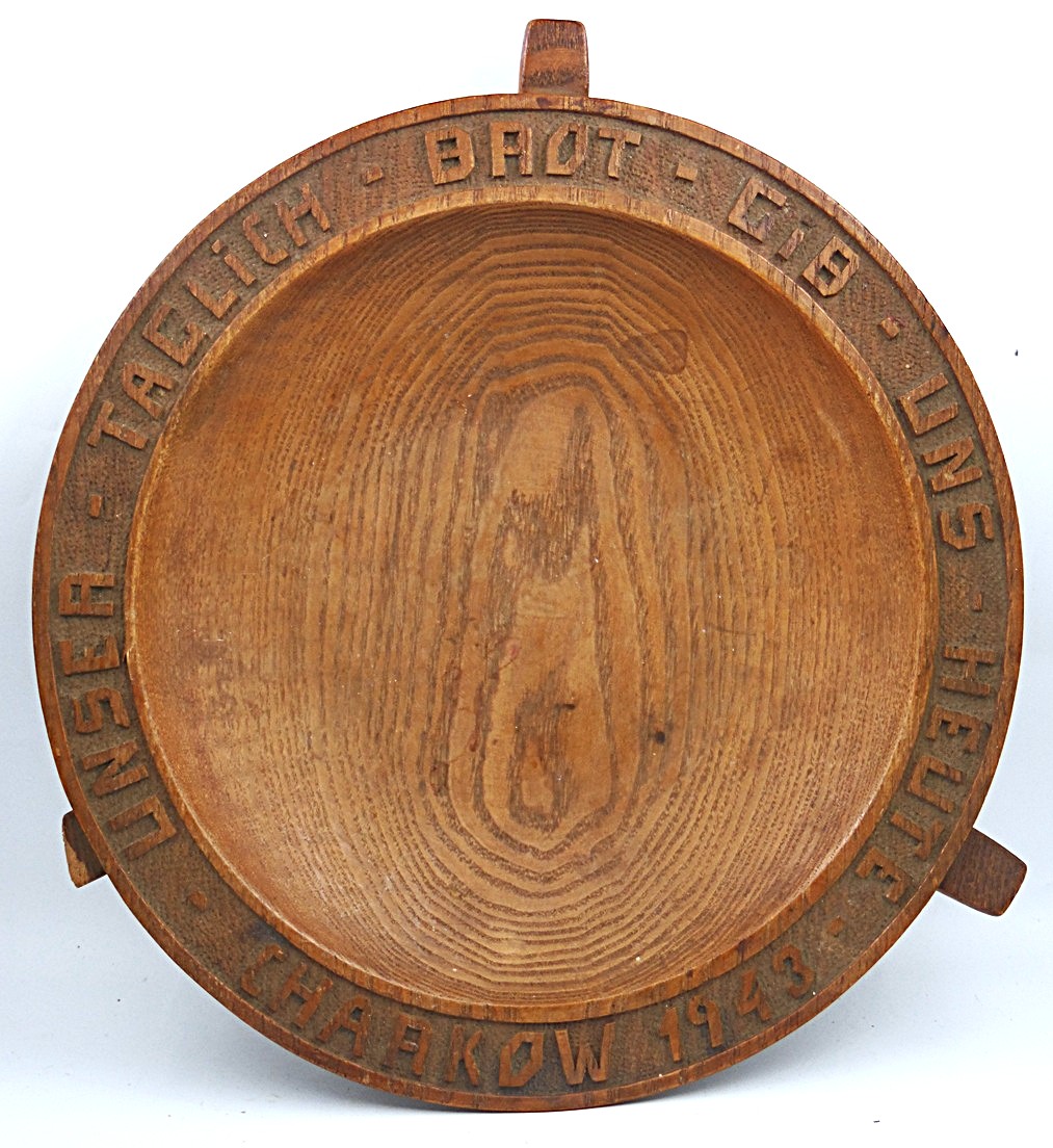 Old wooden plate bowl ’’ Our daily bread give us today Kharkov 1943 ’’ from World War II, it is a hand-carved object of the art movement from the NSDAP Ahnenerbe, diameter approx. 26,5 cm, with a small defect, in good condition, original;