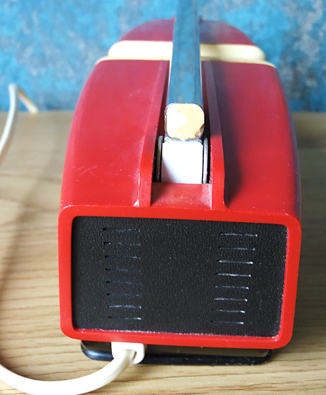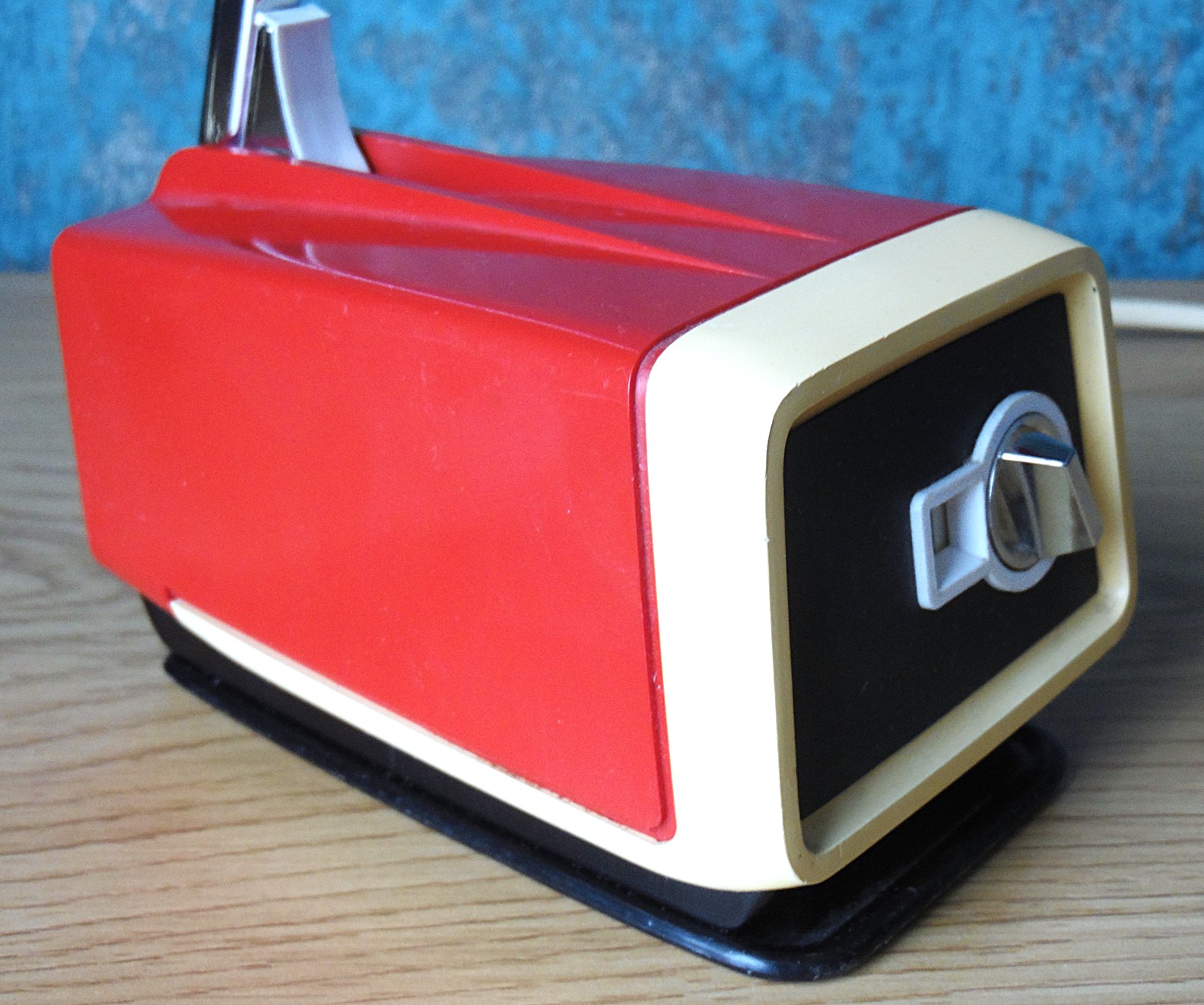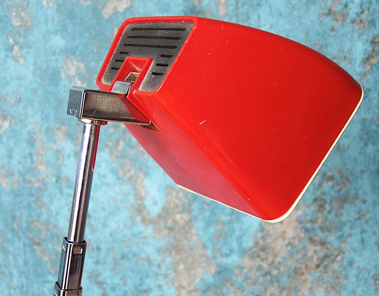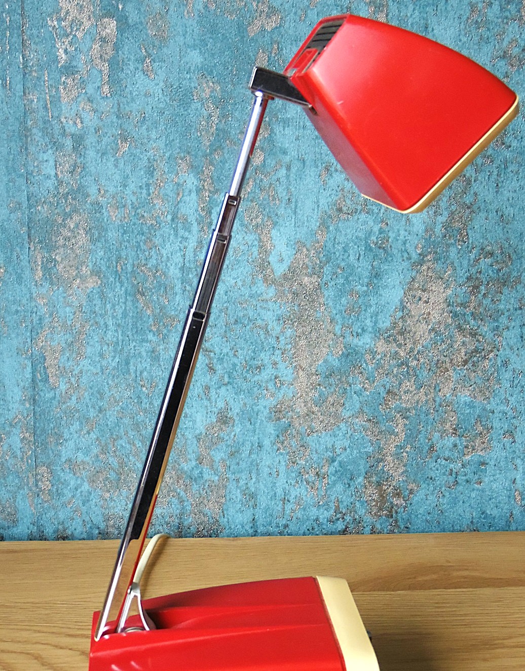 Punase ja valgega kosmoseajastu disainiga teleskoop laualamp, disaininud H. Bødtcher Hansen Taanis, 1960’st aastatest, mudel: Solo Maxi, heas seisukorras, töötab, kaasa ka originaal lambipirn, pildistamise hetkel oli lambis tänapäevane LED pirn, aga see ei vüimalda reguleerida valgustugevust;