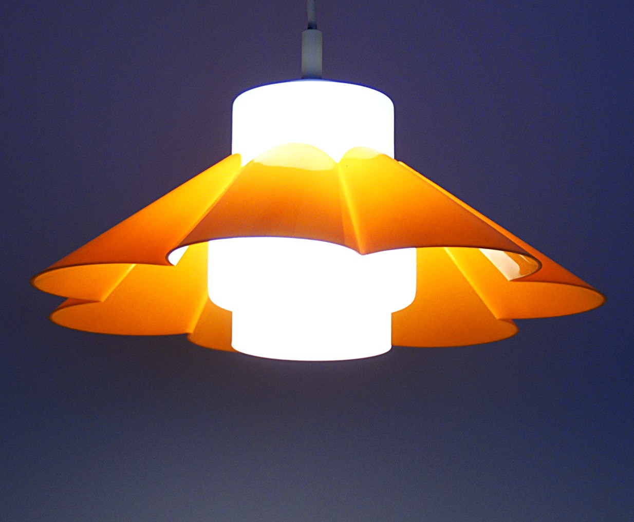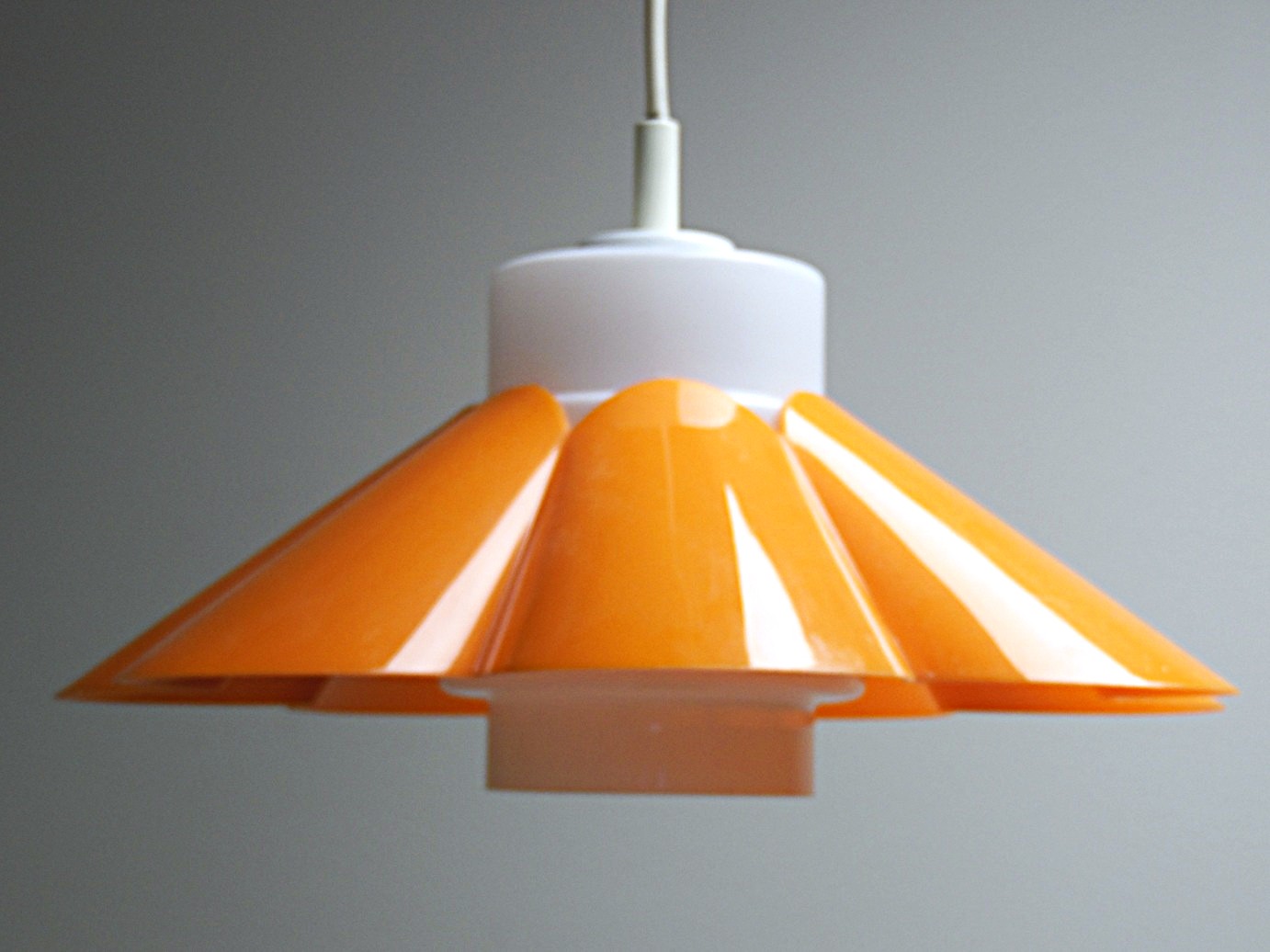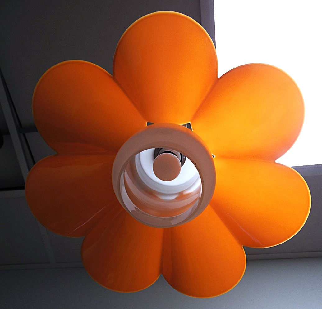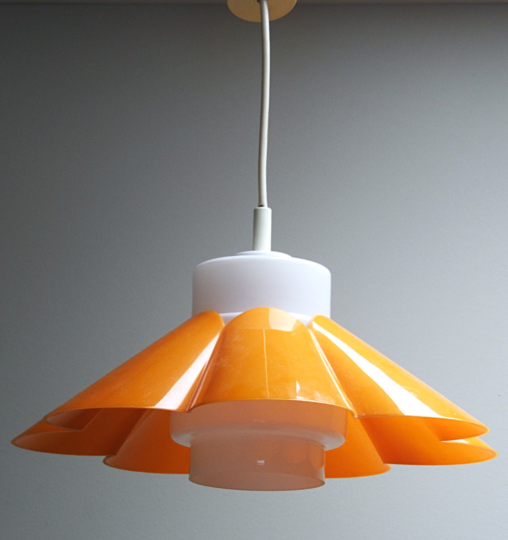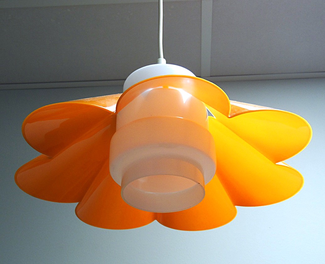 Skandinaavia stiilis vintage laelamp, valmistatud 1970’el aastatel, Soomes, stiilne laelamp lillekujulise oranzi plastvarju ja opaalklaasist kupliga, mõõdud: kõrgus: cm, läbimõõt: 45 cm, lamp on täielikult töökorras ja suurepärases vintage-seisukorras;