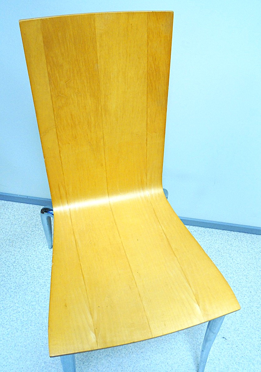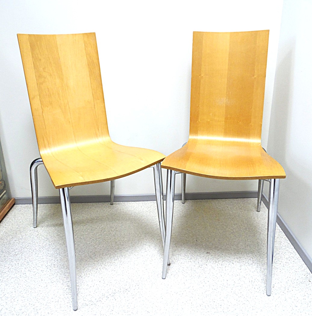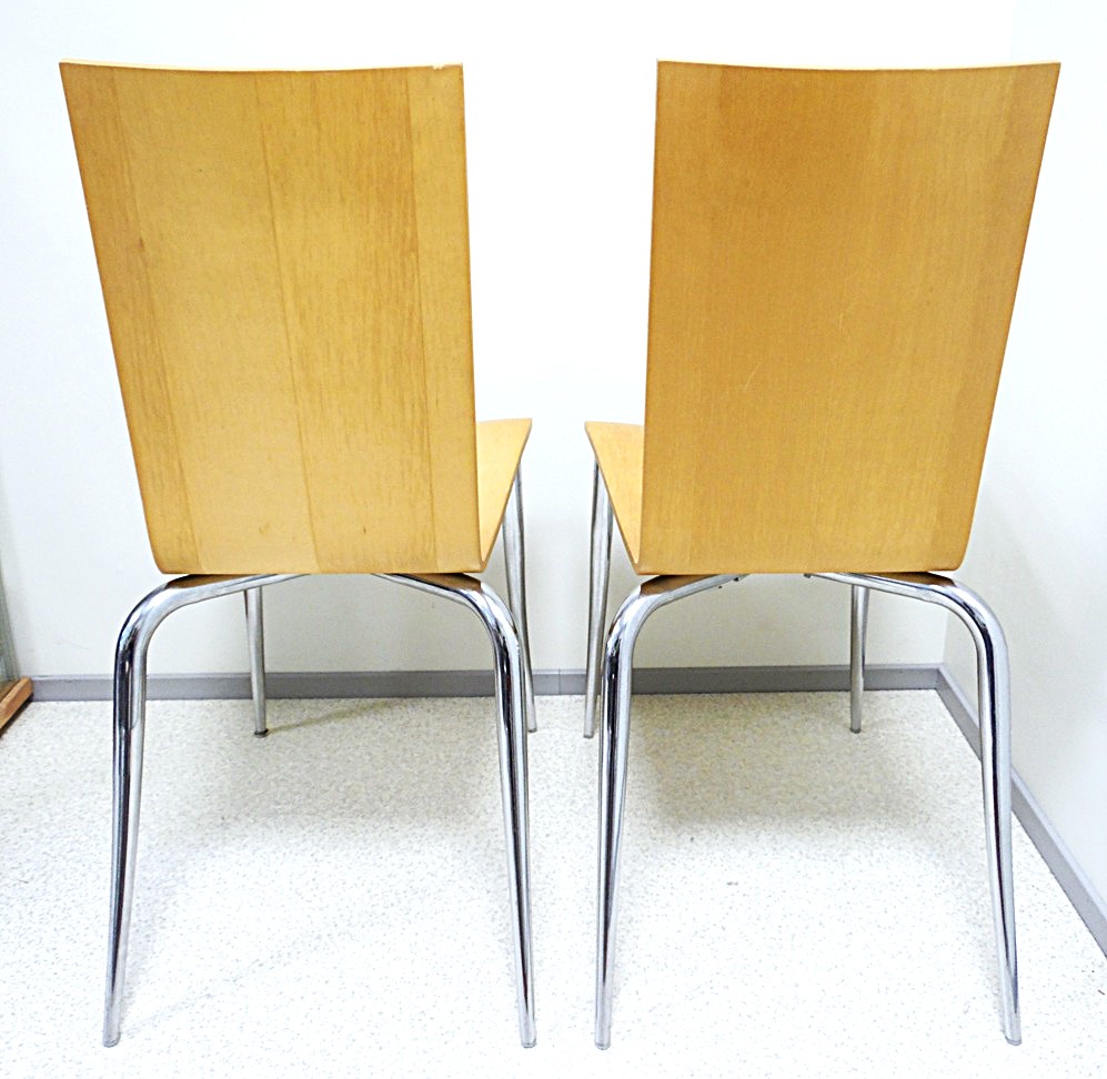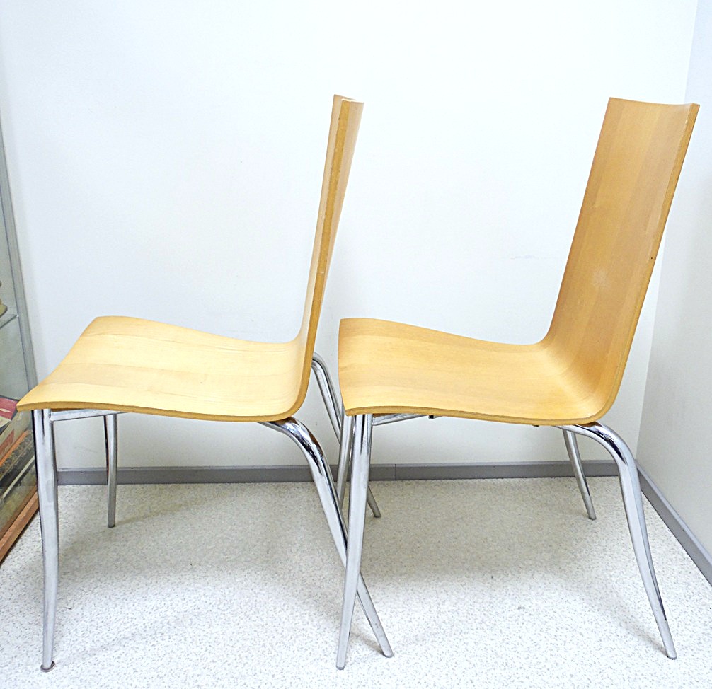 Set of 2 Olly Tango chairs from the 1980’s, Design by Philippe Starck, Manufacturer Driade Aleph, Made in Italy. Elegant minimalist postmodern design, the seat made of thick molded plywood organically shaped metal legs are chromed. Dimensions: Height: 89.54 cm, Width: 40.64 cm, Depth: 55.88 cm, Seat Height: 46.36 cm, there are signs of age and use;