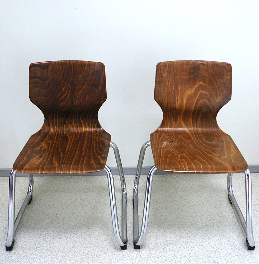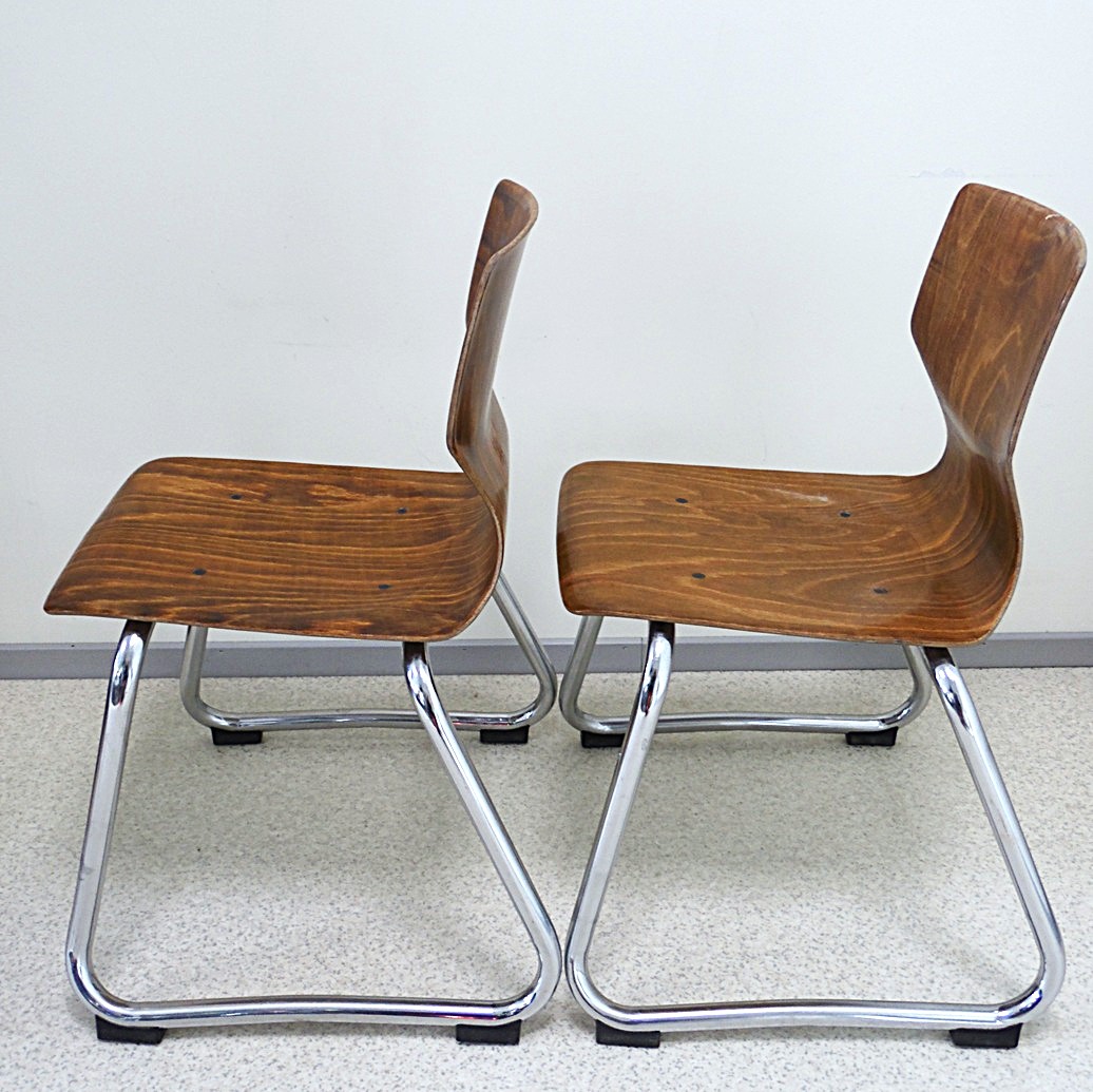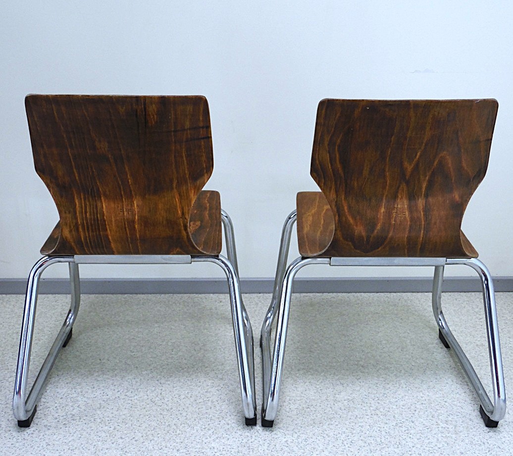 Set of two vintage children’s chairs in the Bauhaus style Flötotto, made in the 1970’s in West Germany, the seat is made of thick molded plywood, the organically shaped metal legs are chrome-plated, the plywood part is teak color, dimensions: height 60 cm, width 43 cm, depth 40 cm, seating height 33 cm, in good condition, but there are signs of age and use;