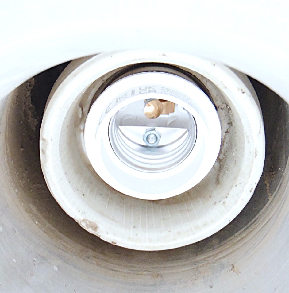 Väiksem Nõukogude aegne tööstuslik laevalgusti, kuppel valmistatud alumiiniumist, lambil pikk torust valmistatud jalg koos laekinnitusega, originaalis kasutab E40 sokliga pirne kuid ülemineku adapteri E40’lt E27’le saab ostuga kaasa, mõõdud: lambikupli läbimõõt 27,4 cm, lambi pikkus (ilma kinnituseta) 43,5 cm, lambi pikkus (koos laekinnitusega) 99,8 cm, toitekaabel tänapäevane, esineb vanusest ja kasutusest tulenevaid jälgi;
