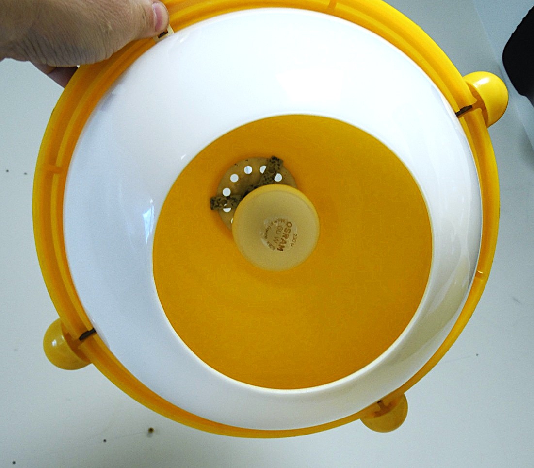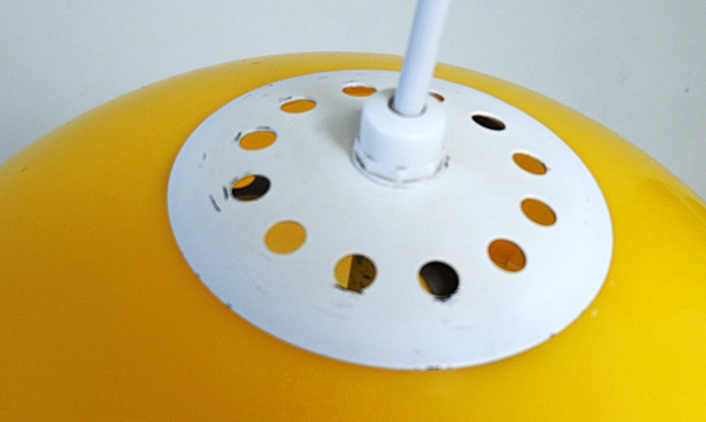 Nõukogude aegne Space Age stiilis ümar laelamp, valmistatud 1970’el aastatel tehases “Estoplast”, materjal plastik, värvus kollane / valge, mõõdud: läbimõõt 36 cm, kõrgus 30 cm, kasutab E27 sokliga lambipirni, täiesti töökorras, heas säilivuses, kuid esineb eelnevast kasutusest tulenevaid minimaalseid jälgi ja kulumist;