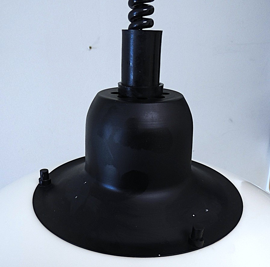 Soviet Space Age style height-adjustable Estoplast ceiling lamp Model 780, made in the 1970’s at the “Estoplast” factory, material plastic, color black / white, dimensions: diameter 24 cm, height 39,7 cm, uses an E27 bulb, fully working order, unused, in very good vintage condition, but there are minimal marks and wear;