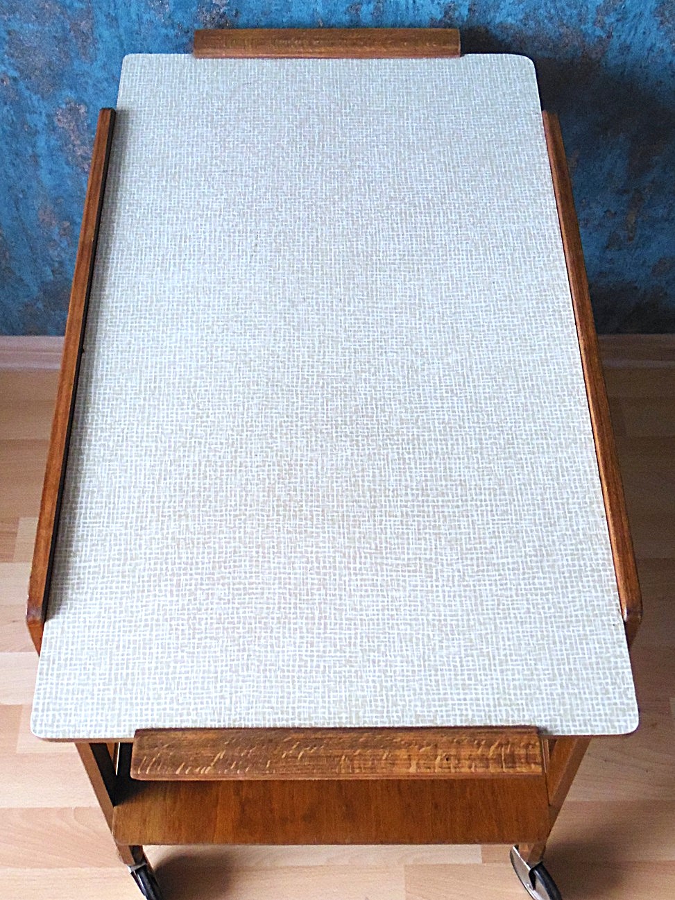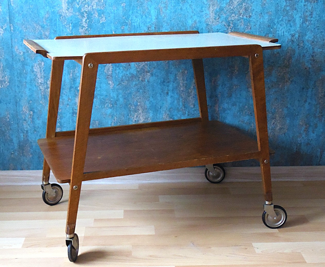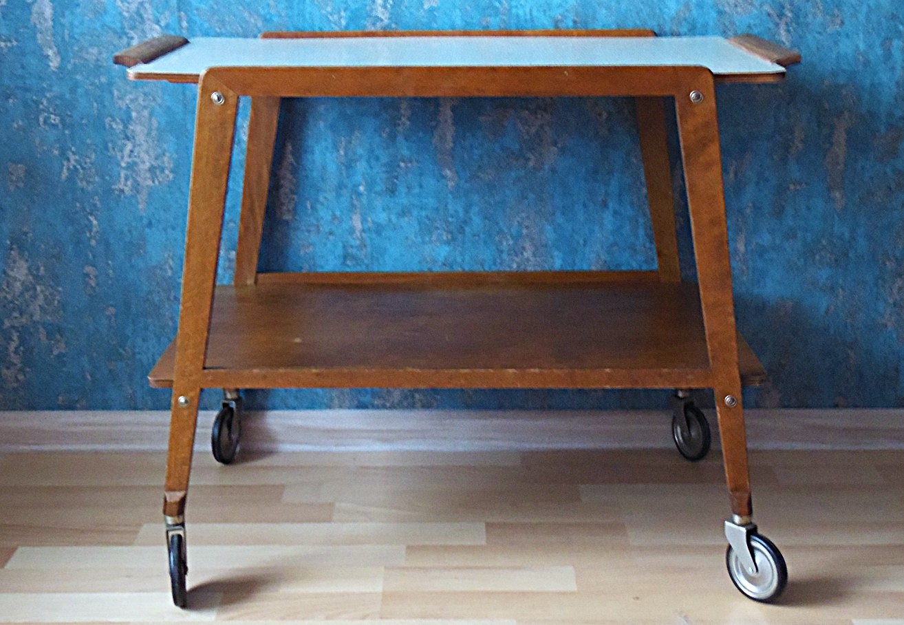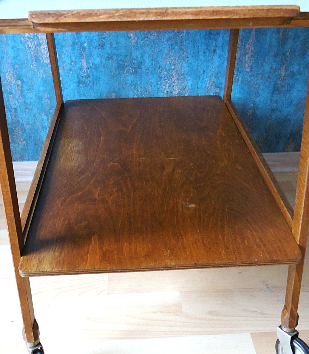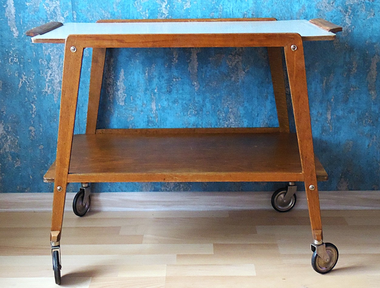 Vintage 1960’ndatel aastatel valmistatud puidust serveerimislaud, laud on ratastel, oma vanuse kohta väga heas seisukorras, mõningate kulumisjälgedega. Ohutu transportimise tagamiseks võetakse käru saatmiseks lahti, eemaldatakse 8 kruvi ja rattad. Mõõdud: