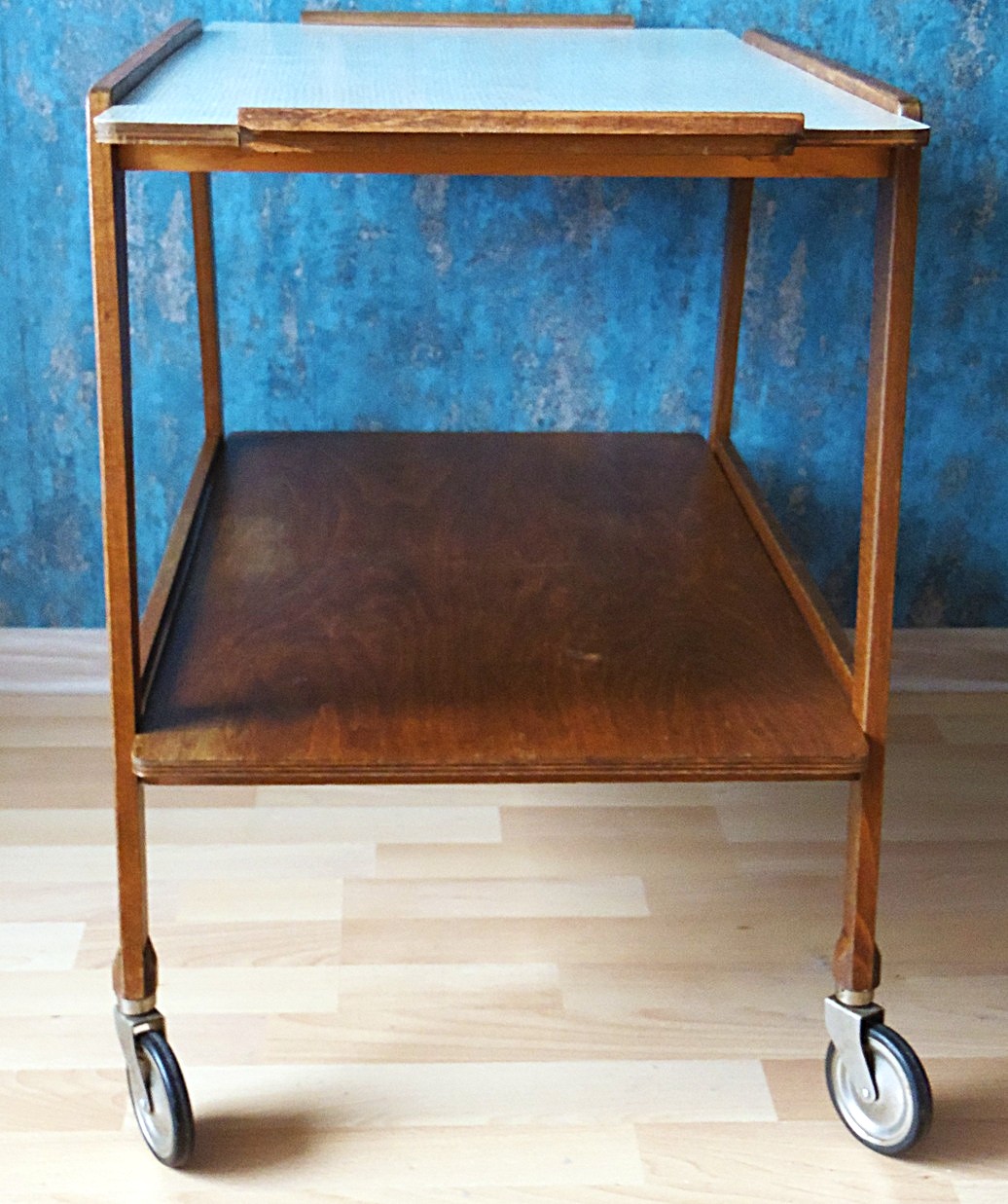 Vintage 1960’s serving trolley on wheels, in very good condition for its age, with some signs of wear. For safe shipping, it will be disassembled, 8 screws and the wheels will be removed.