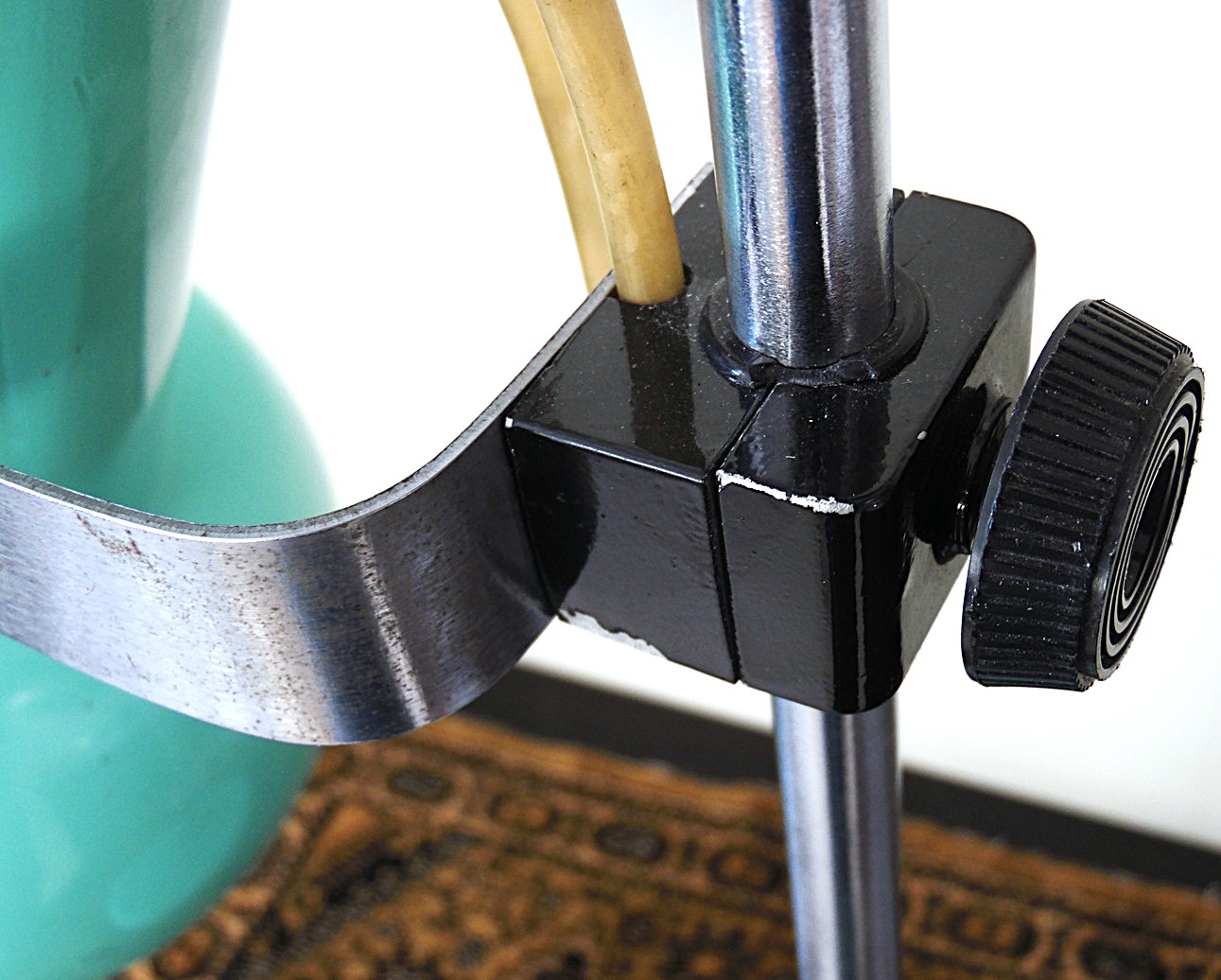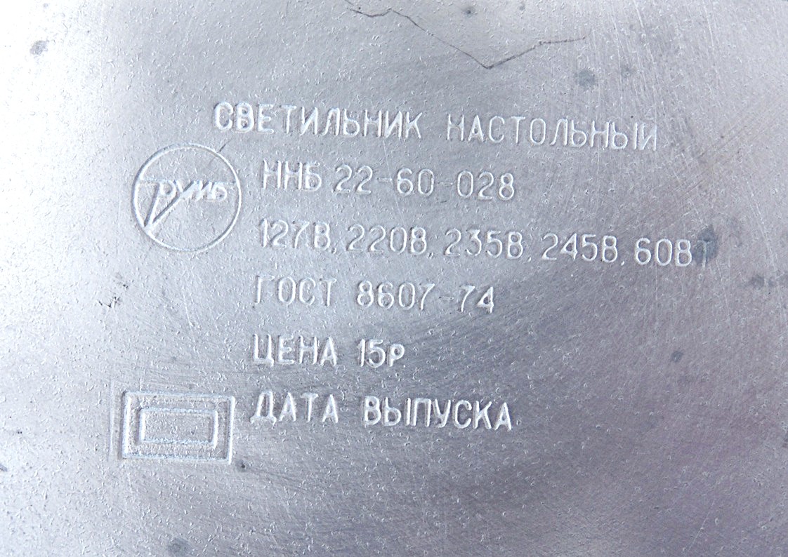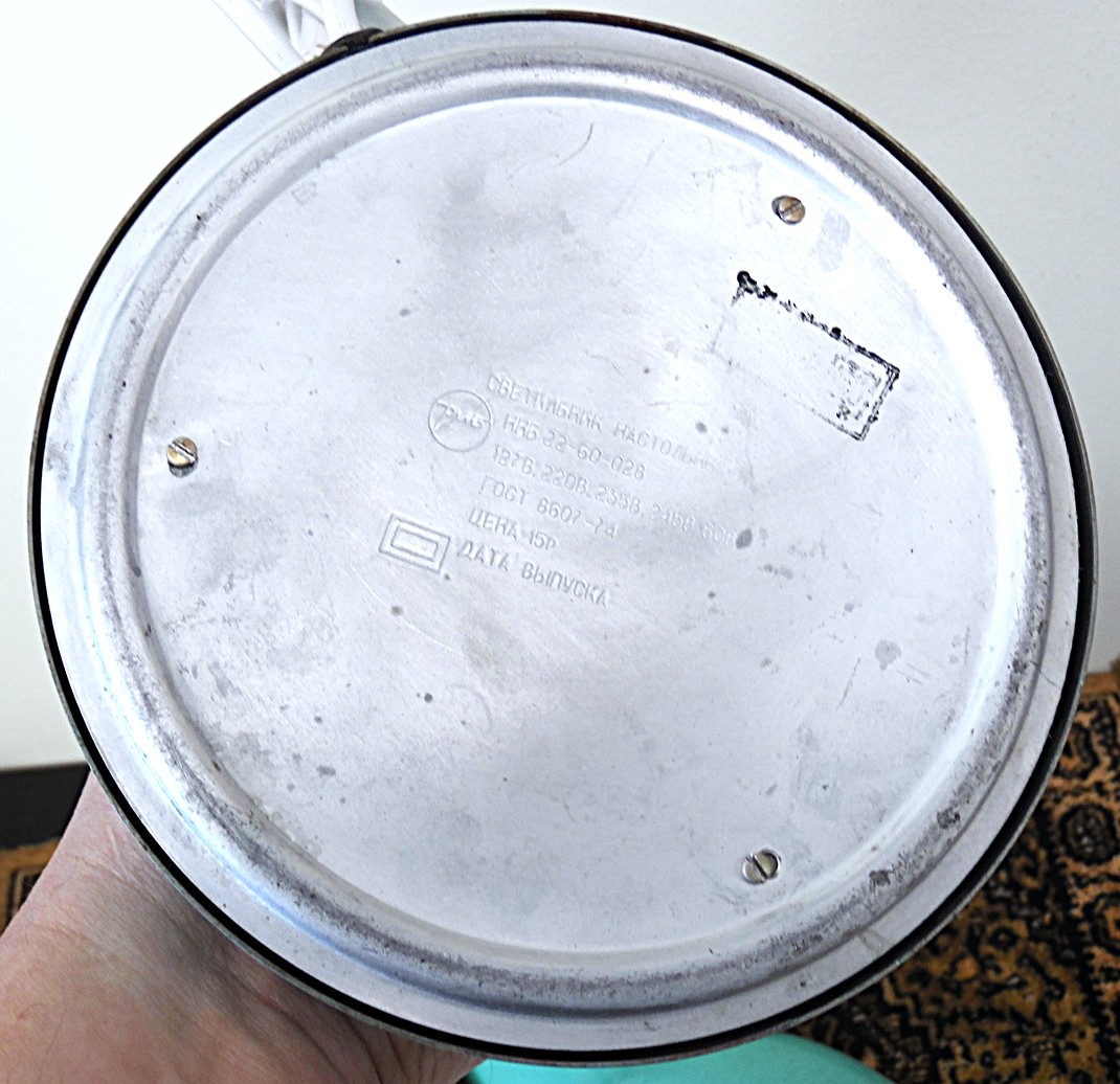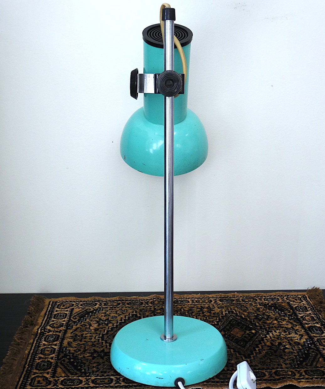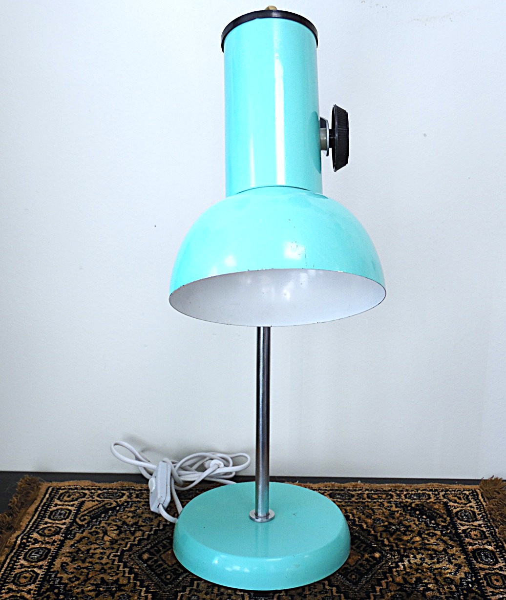 Vintage bauhausi stiilis laualamp, valmistatud 1970’el aastatel Nõukogude Liidus, valmistatud metallist, värvus HEX (värvikaardi järgi), mõõdud: laius 17,5 cm, pikkus 34 cm, kõrgus 50,3 cm, väga heas töötavas seisukorras, kuid esineb vanusest ja kasutusest tulenevaid jälgi;
