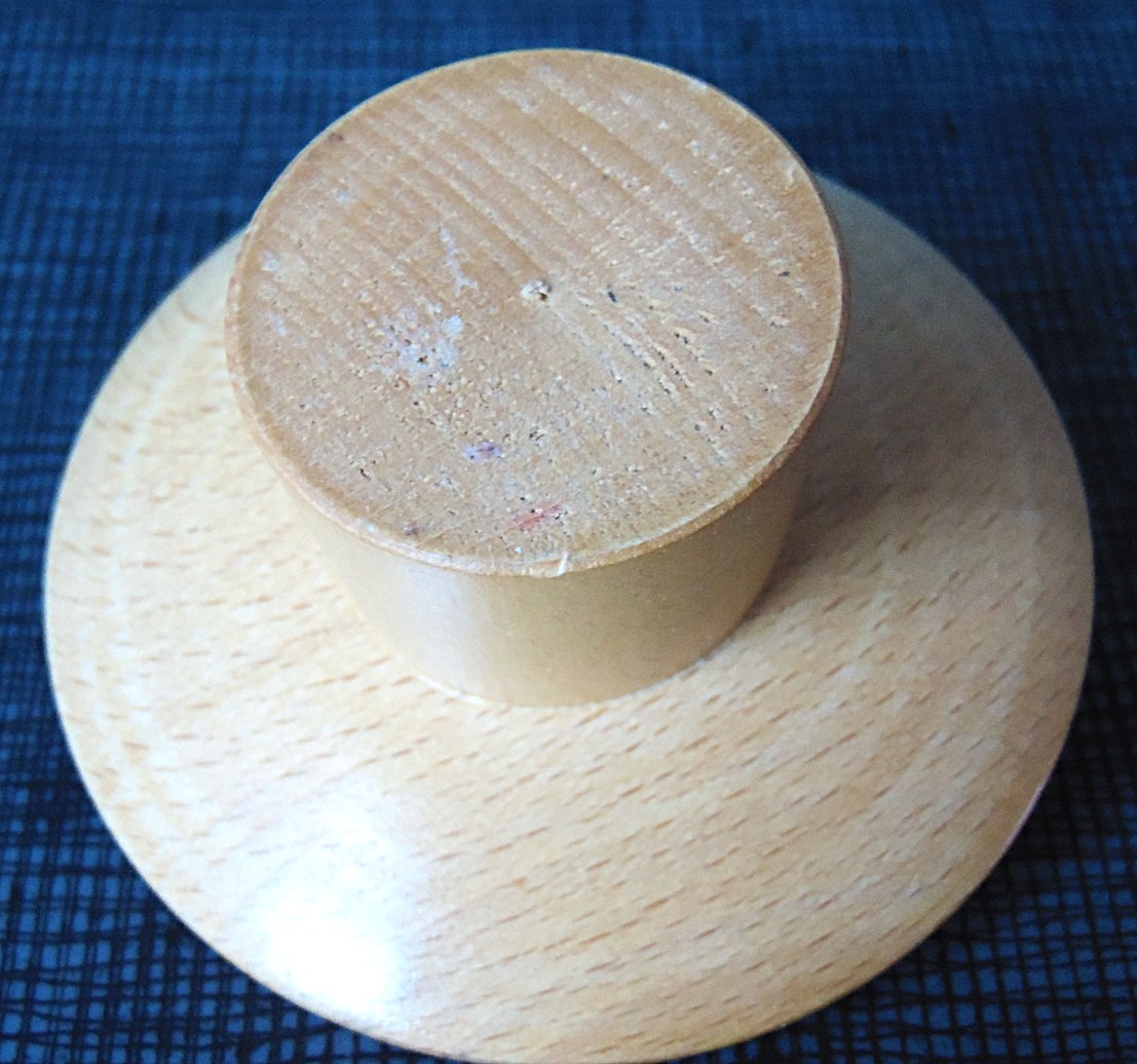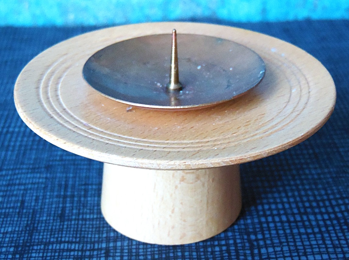 Vintage küünlajalg, valmistatud puidust ja vasest, kõrgus 5,5 cm, läbimõõt 9,7 cm; Küünal ei ole oksjoni osa ja ei tule ostuga kaasa!