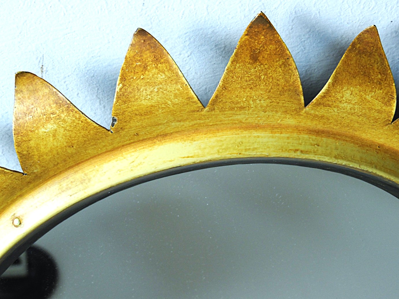 Vintage lillekujuline seinapeegel, tootja ettikettiga, valmistatud F. Radspieler & Cie München poolt 70’el aastatel Lääne Saksamaal, peegliraam värvitud ja lakitud metallist, tagakülg kaetud puiduga, mõõdud: koguläbimõõt 36 cm, peegli läbimõõt 24,2 cm, esineb vanusest tulenevaid kriimustusi ja kasutusjälgi;