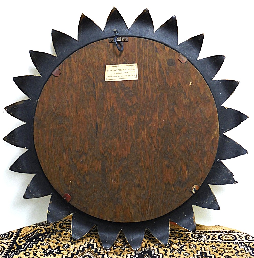 Vintage flower-shaped wall mirror, with manufacturer’s label, made by F. Radspieler & Cie München in the 1970’s in West Germany, mirror frame made of painted and varnished metal, back covered with wood, dimensions: total diameter 36 cm, mirror diameter 24.2 cm, there are scratches and signs of use due to age;