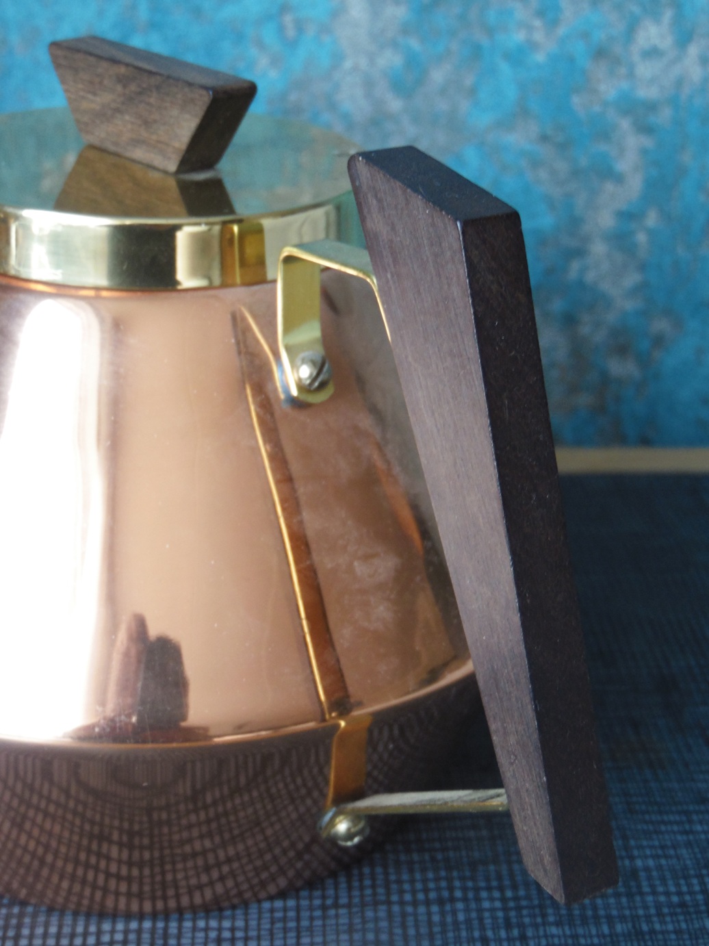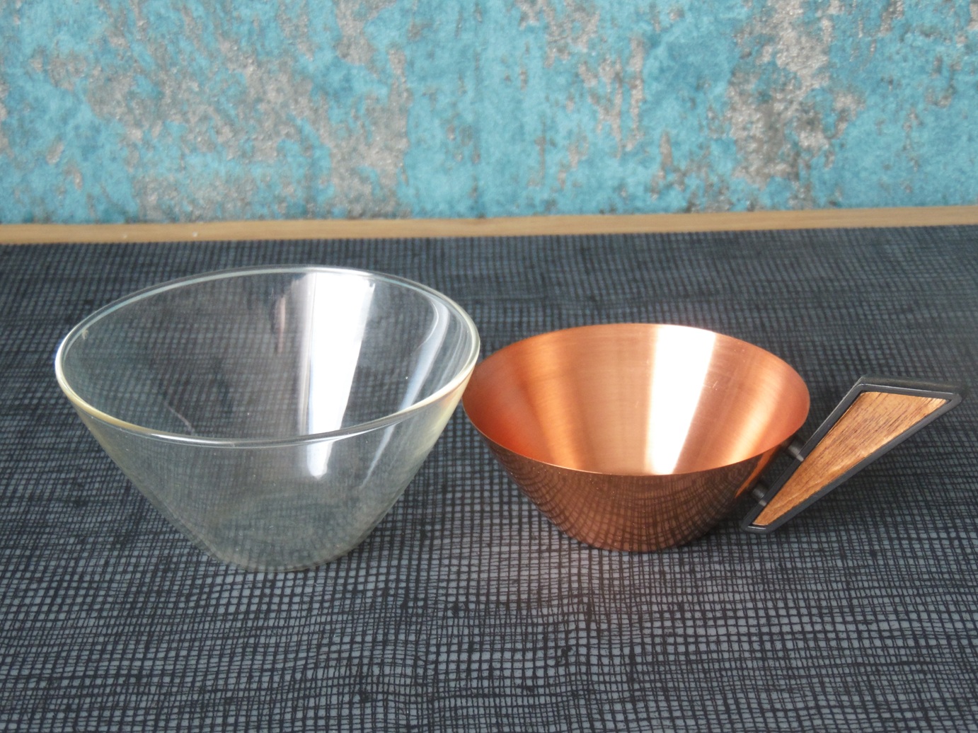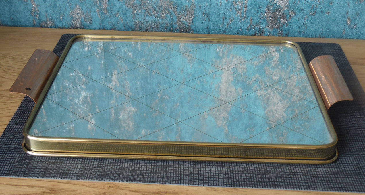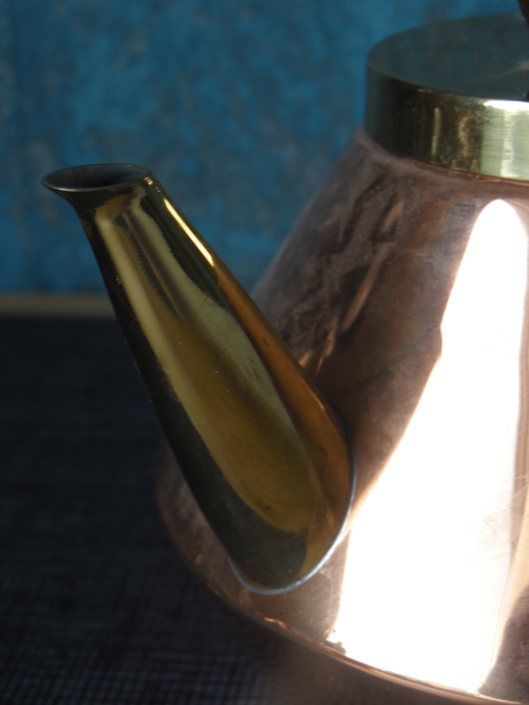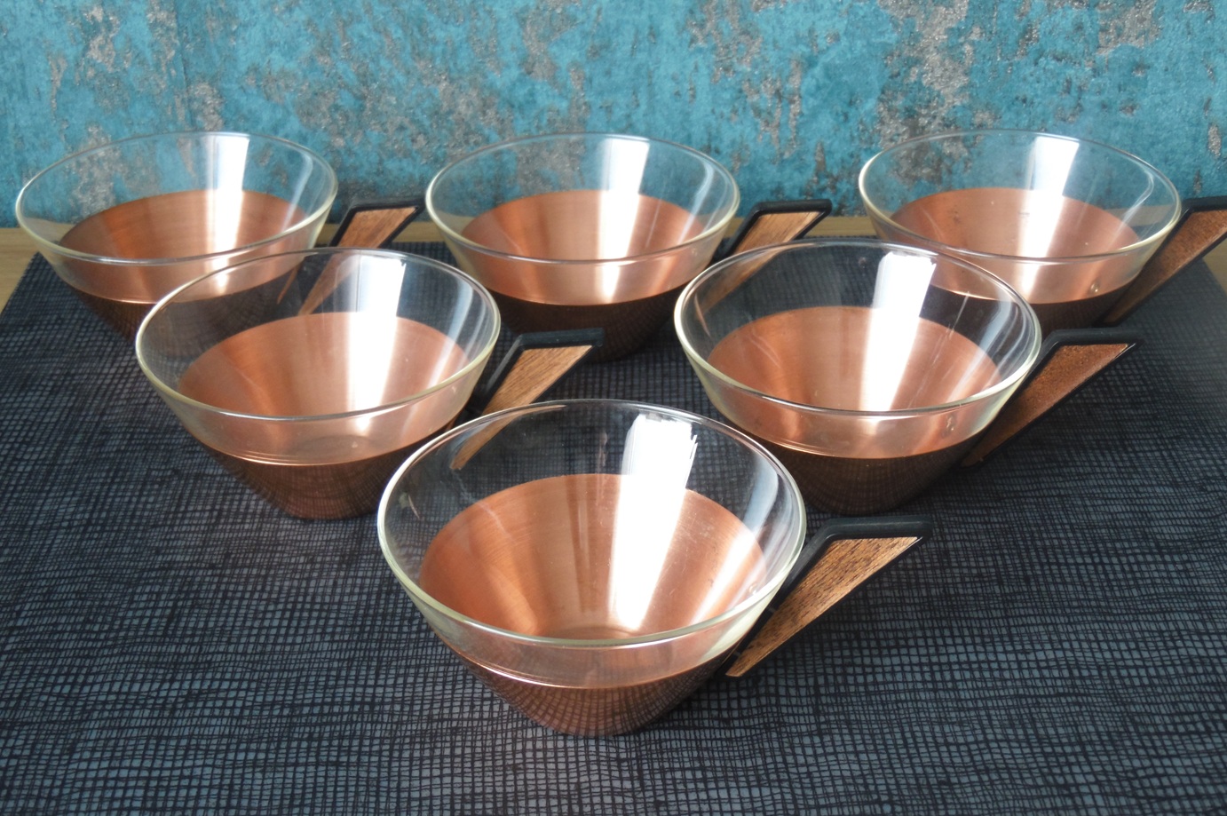 Vintage Jena glass tea service set for 6 people, from the 1960’s/70’s, made of brass, copper, teak, and wood, manufactured by Schott Mainz. The set consists of a copper and bronze teapot, six tea glasses with copper bases, and a tray with a decorated, mirrored bottom. Tray dimensions: 37 x 24 cm. teapot height: 14.5 cm, tea glasses height: 5 cm and diameter from the top: 9,5 cm;