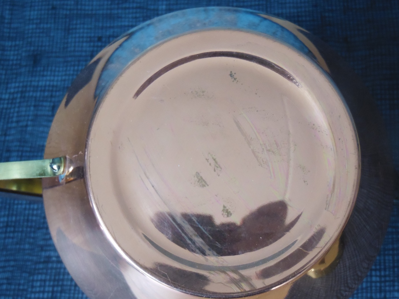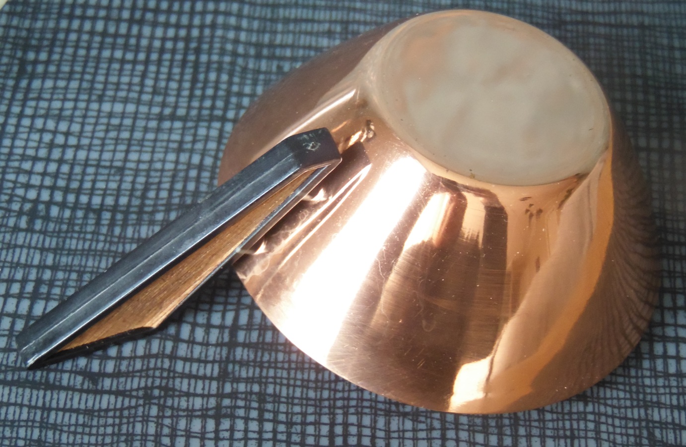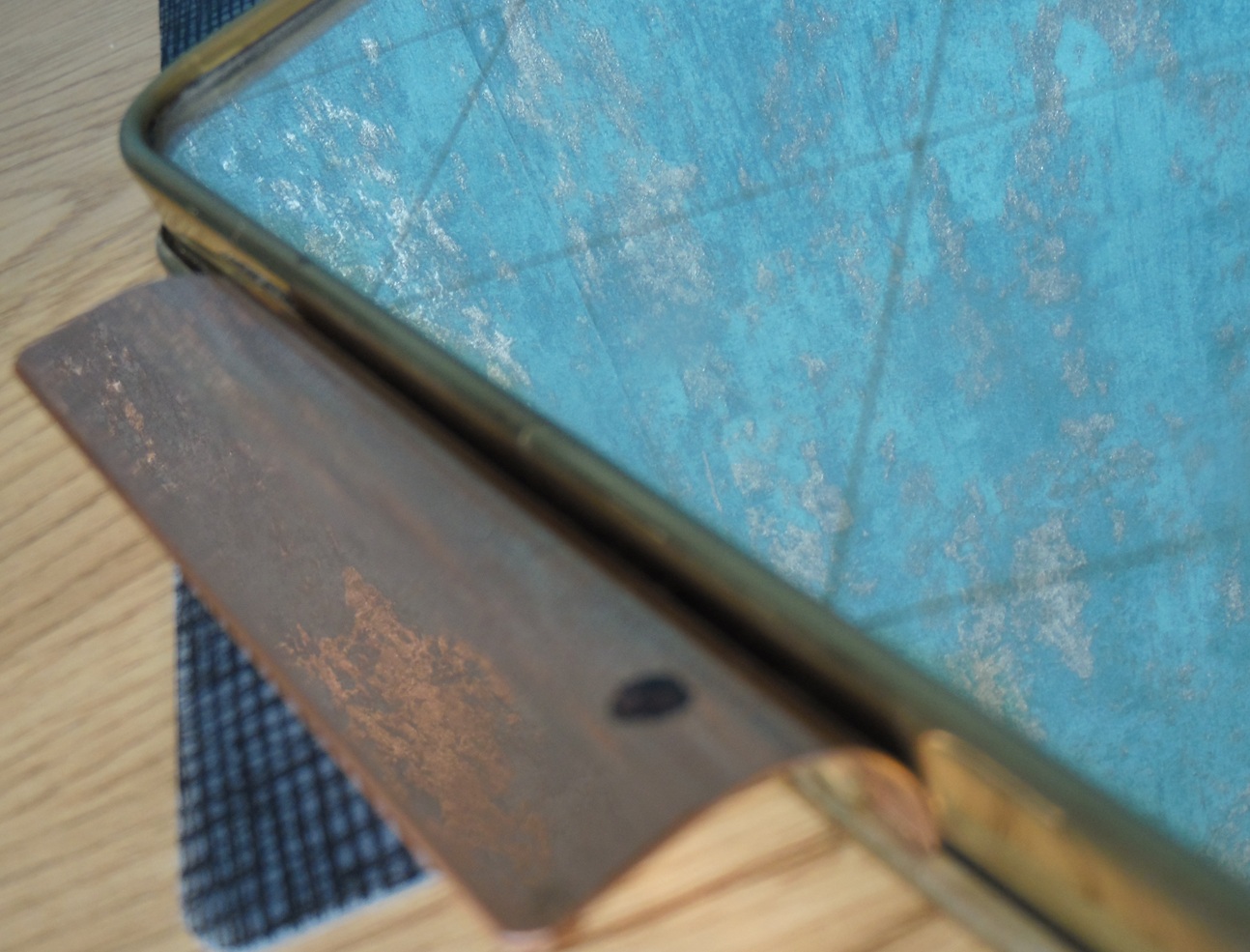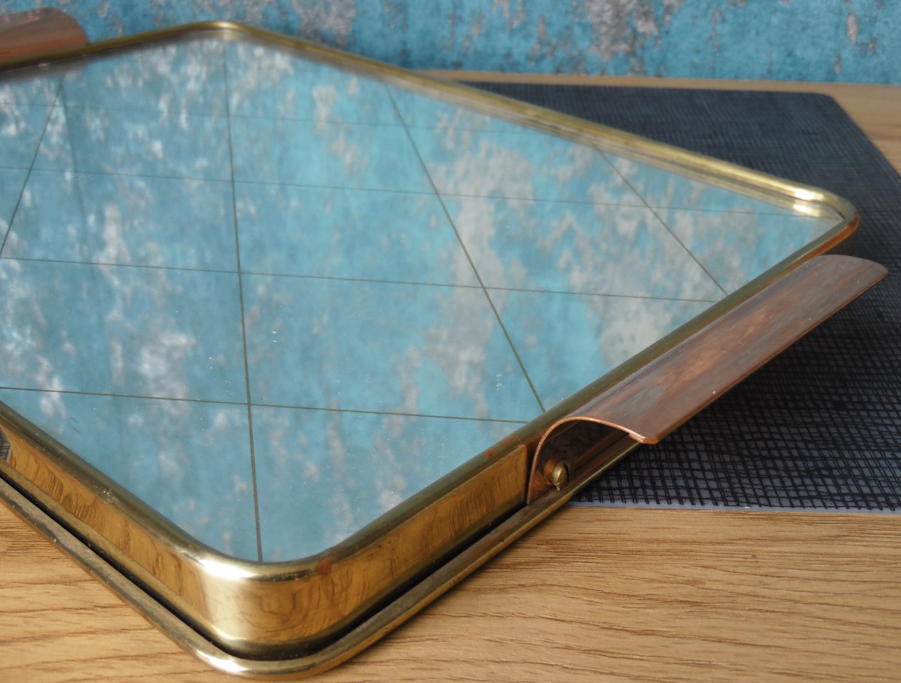Vintage Jena glass tea service set for 6 people, from the 1960’s/70’s, made of brass, copper, teak, and wood, manufactured by Schott Mainz. The set consists of a copper and bronze teapot, six tea glasses with copper bases, and a tray with a decorated, mirrored bottom. Tray dimensions: 37 x 24 cm. teapot height: 14.5 cm, tea glasses height: 5 cm and diameter from the top: 9,5 cm;