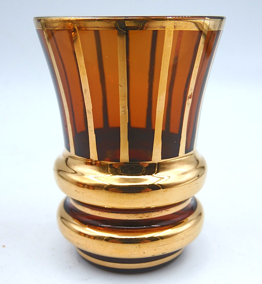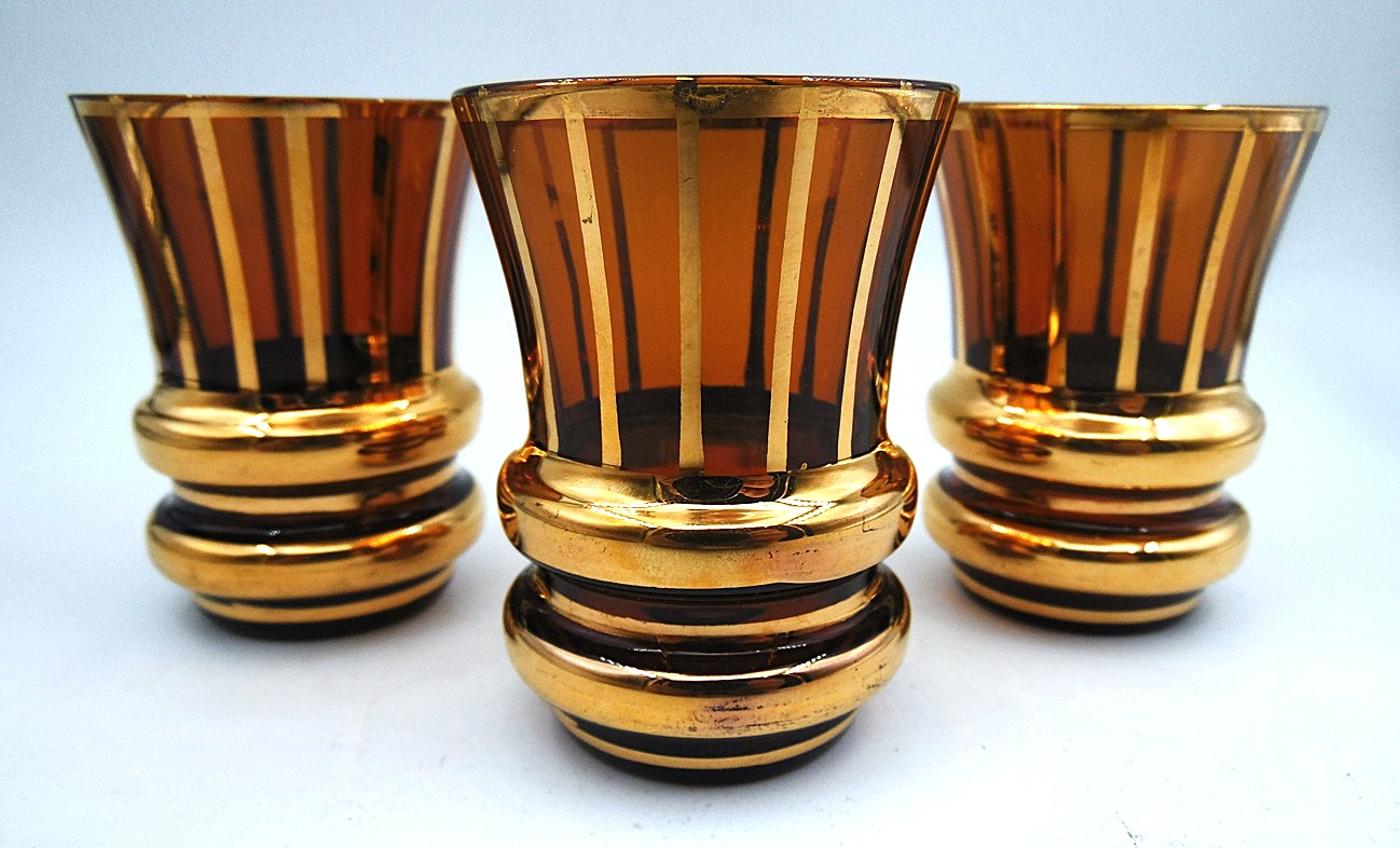 Vintage Mid-Century Bohemia smoked glass crystal 3 shot glasses, from the 1970’s, decorated with gilded decor, shot glass height 6,2 cm;