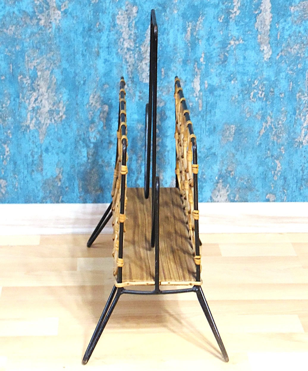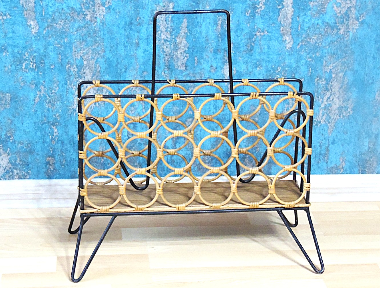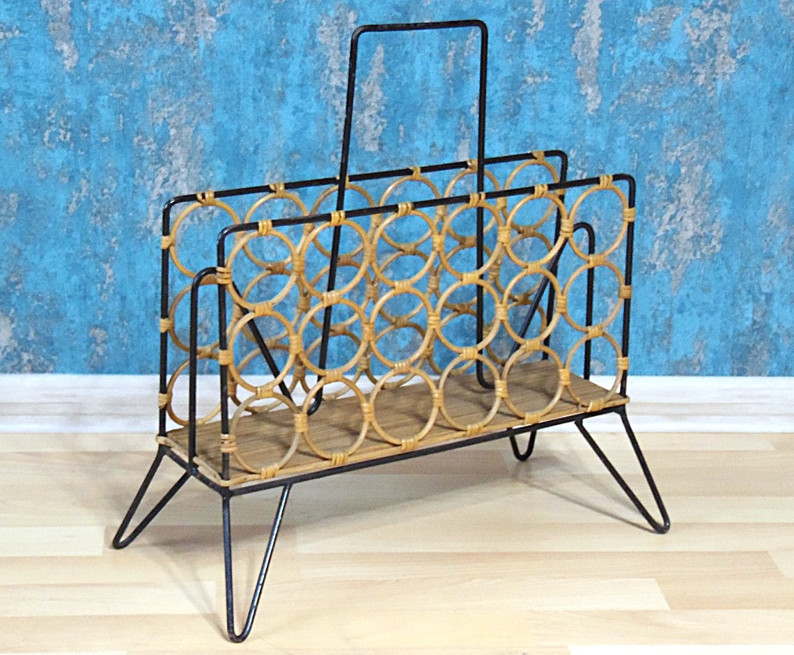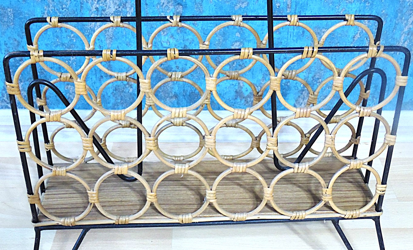 Vintage Boho Chic stiilis 1970’e aastate keskpaiga disainiga ajakirja/ajalehtede hoidja/riiul, valmistatud metallist ja rotangist. Väga heas seisukorras, ilma pragude, puuduvate osade või muude vigadedeta. Minimaalsed kulumisjäljed lisavad sellele veelgi võlu. Esimesel pildil olevad raamatud ei kuulu oksjonile ega tule ostuga kaasa!