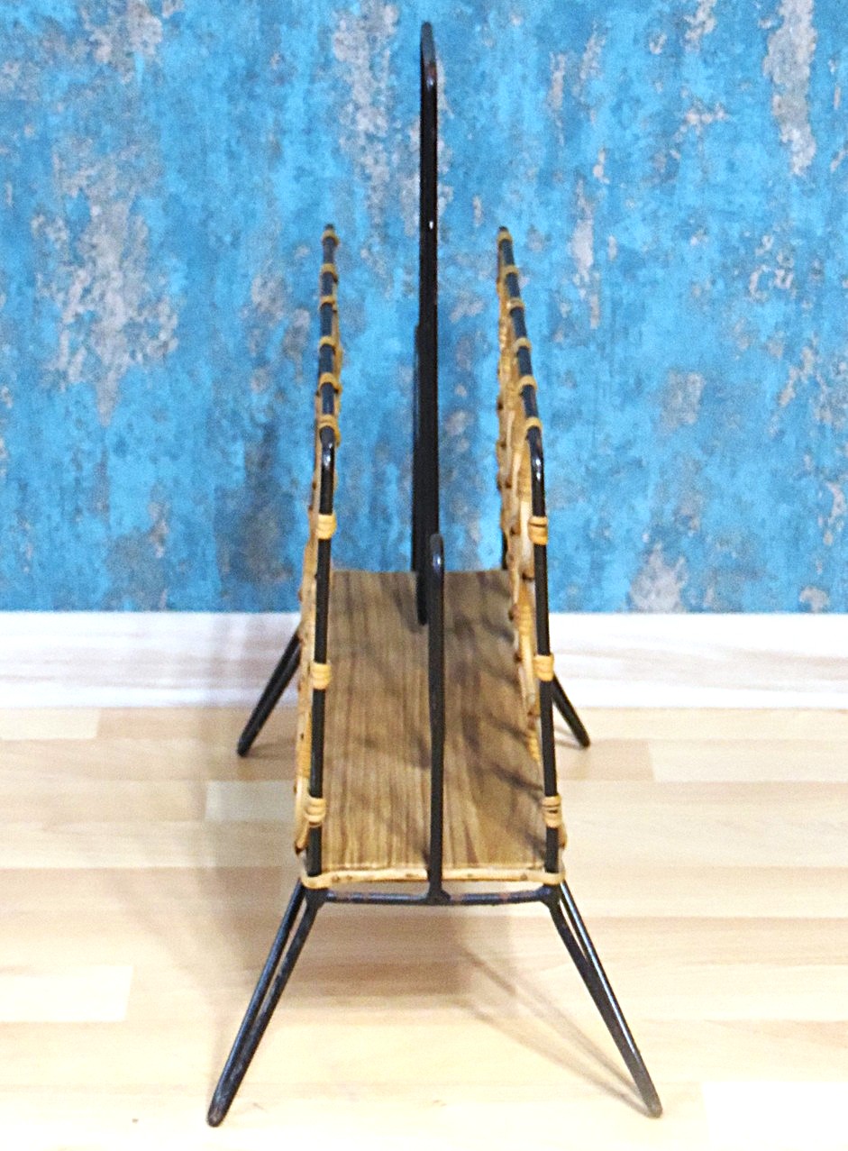 Vintage mid-century design magazine rack from the 1970’s, made of metal and rattan, Boho Chic style. In very good condition, with no breaks, missing pieces, or cracks. Minimal signs of age-related wear only add to its charm.The books in the first picture are not part of the auction and do not come with the purchase!