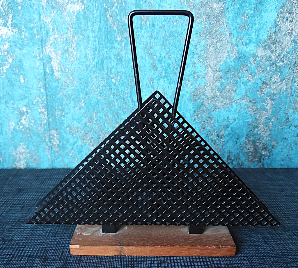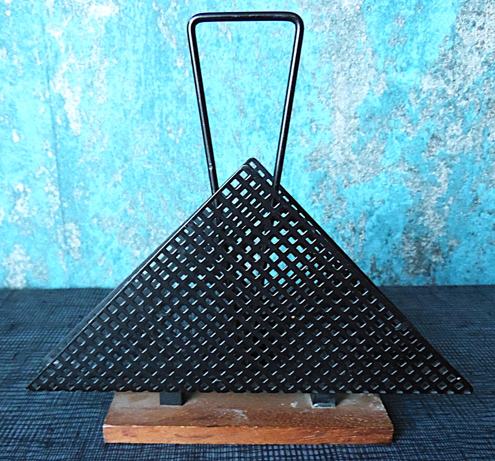 Vintage Mid Century Design Napkin Holder, Danish Design from 60’s, Triangle Perforated Sheet, height with handle: 16,8 cm, width 18,7 cm;