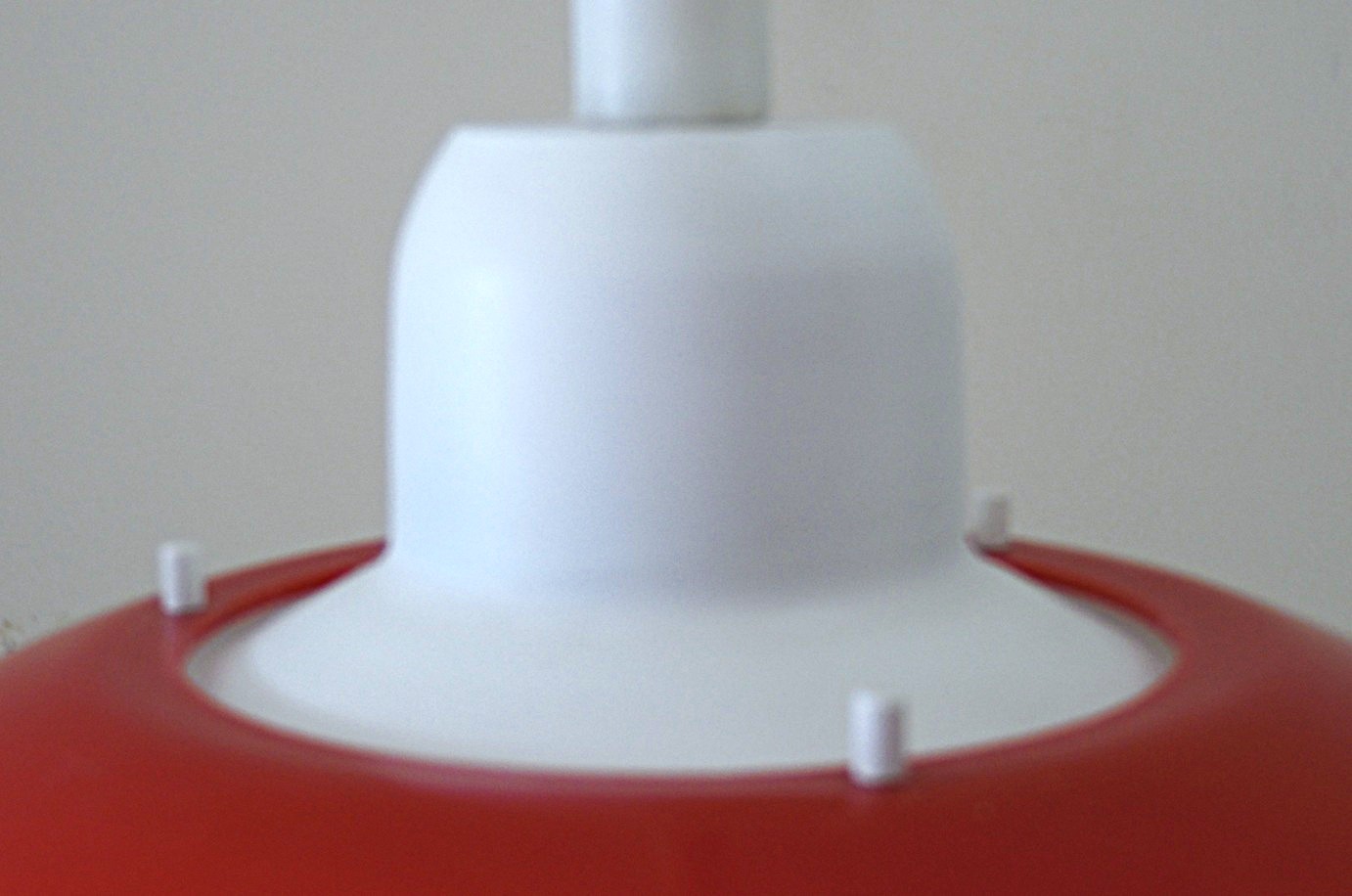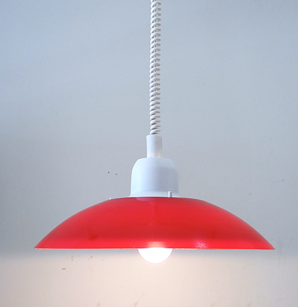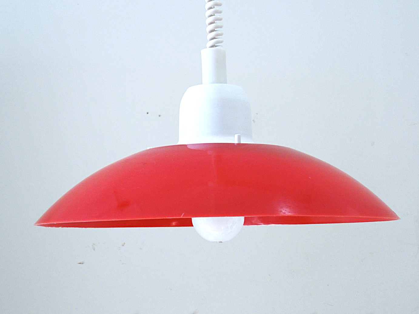 Vintage Soviet-era height-adjustable ceiling lamp, manufacturer “Estoplast”, made in the 1990’s, made from plastic and metal, dome diameter 40 cm, dome height 22 cm, suitable for E27 light bulbs up to 60W, in full working order but with signs of wear due to previous use and age;