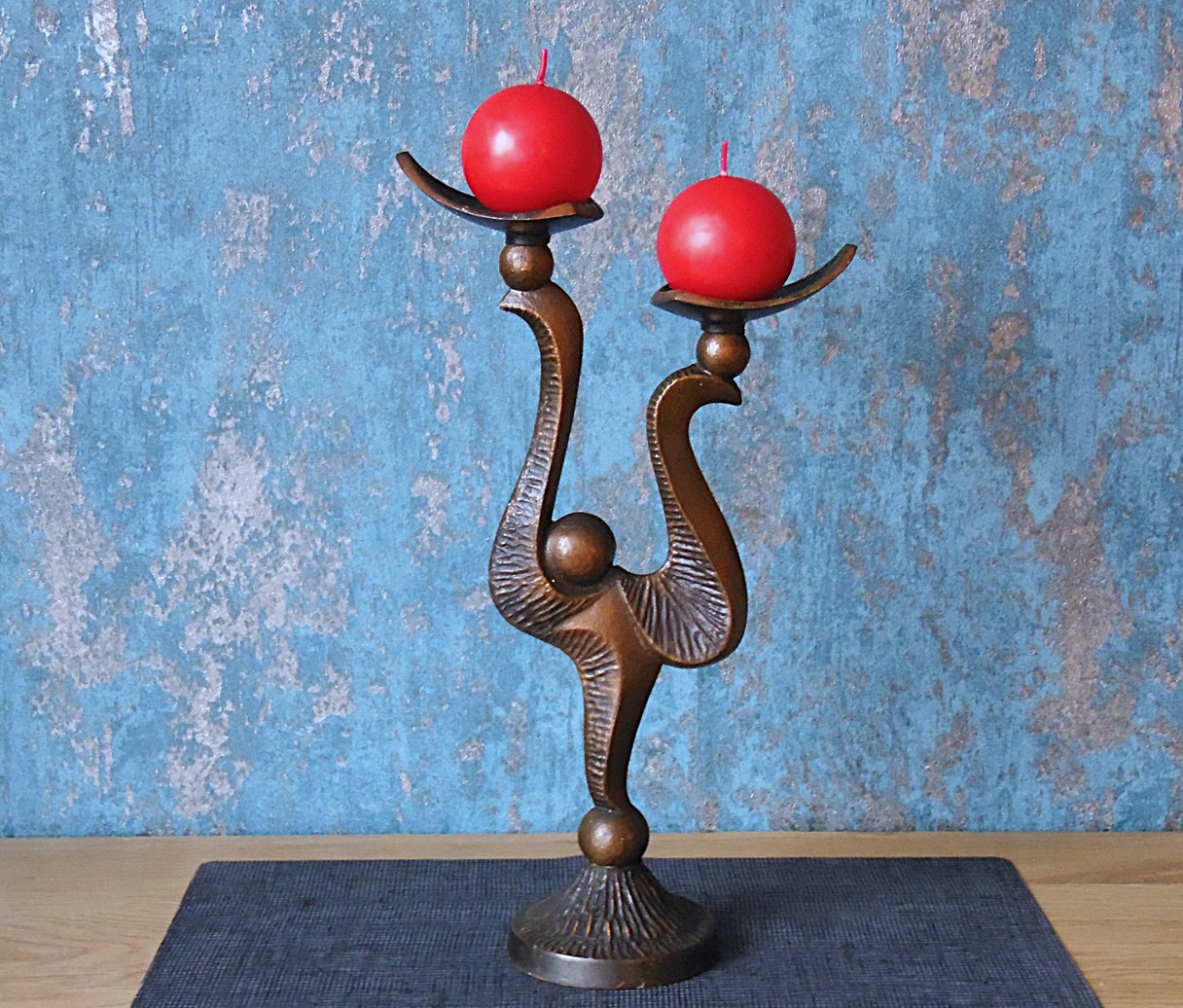 Vintage Soviet-era modern bronze candleholder for two candles, from the 70’s, height 35,4 cm, width 19,5 cm, bottom diameter 9,4 cm; Candles are not included with purchase!