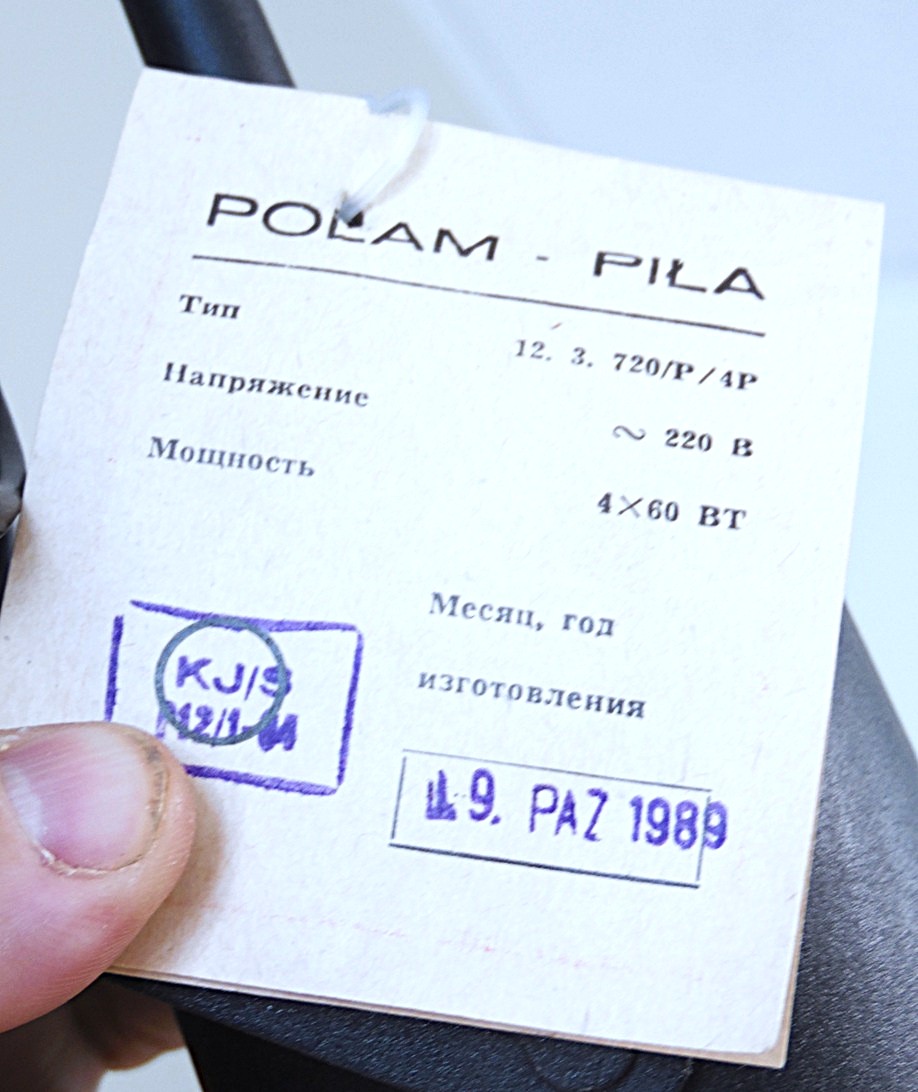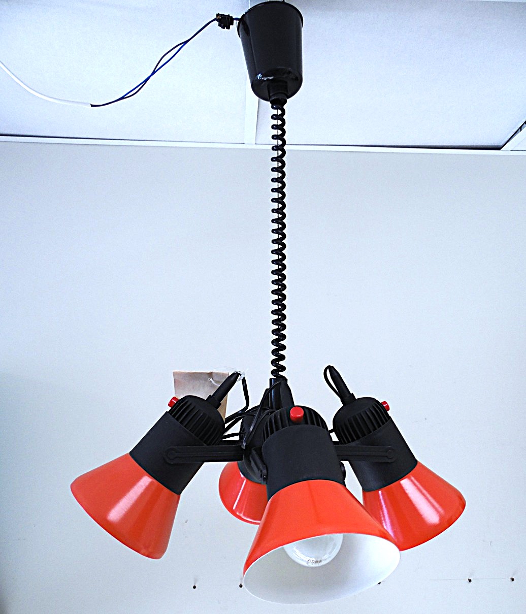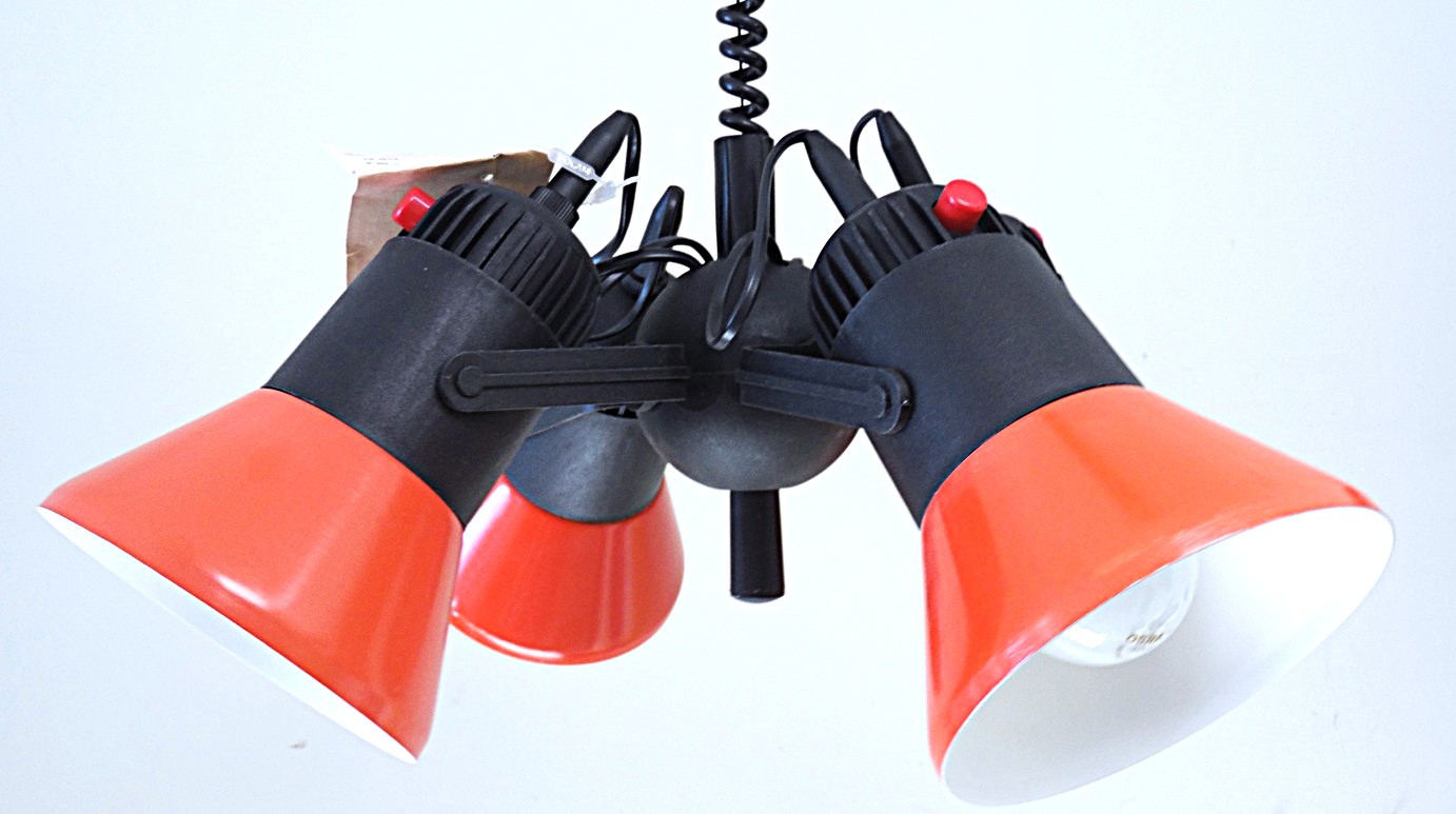 Vintage Space Age 4’ne spotvalgusti, valgustil regureeritav tõstuk, igat spot’i saab eraldi sisse ja välja lülitada, värvus oranz/must, valmistatud 1989. aastal Polam-Pila tehases Poolas. Täiesti ideaalses säilivuses ja töökorras, pildistamiseks võetud välja originaal pakendist, säilinud ka omaaegsed paberettikettid millel näha nii valmistamise kui müügi ajad;