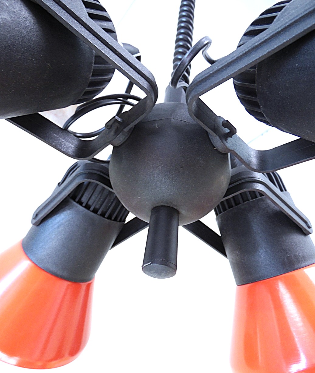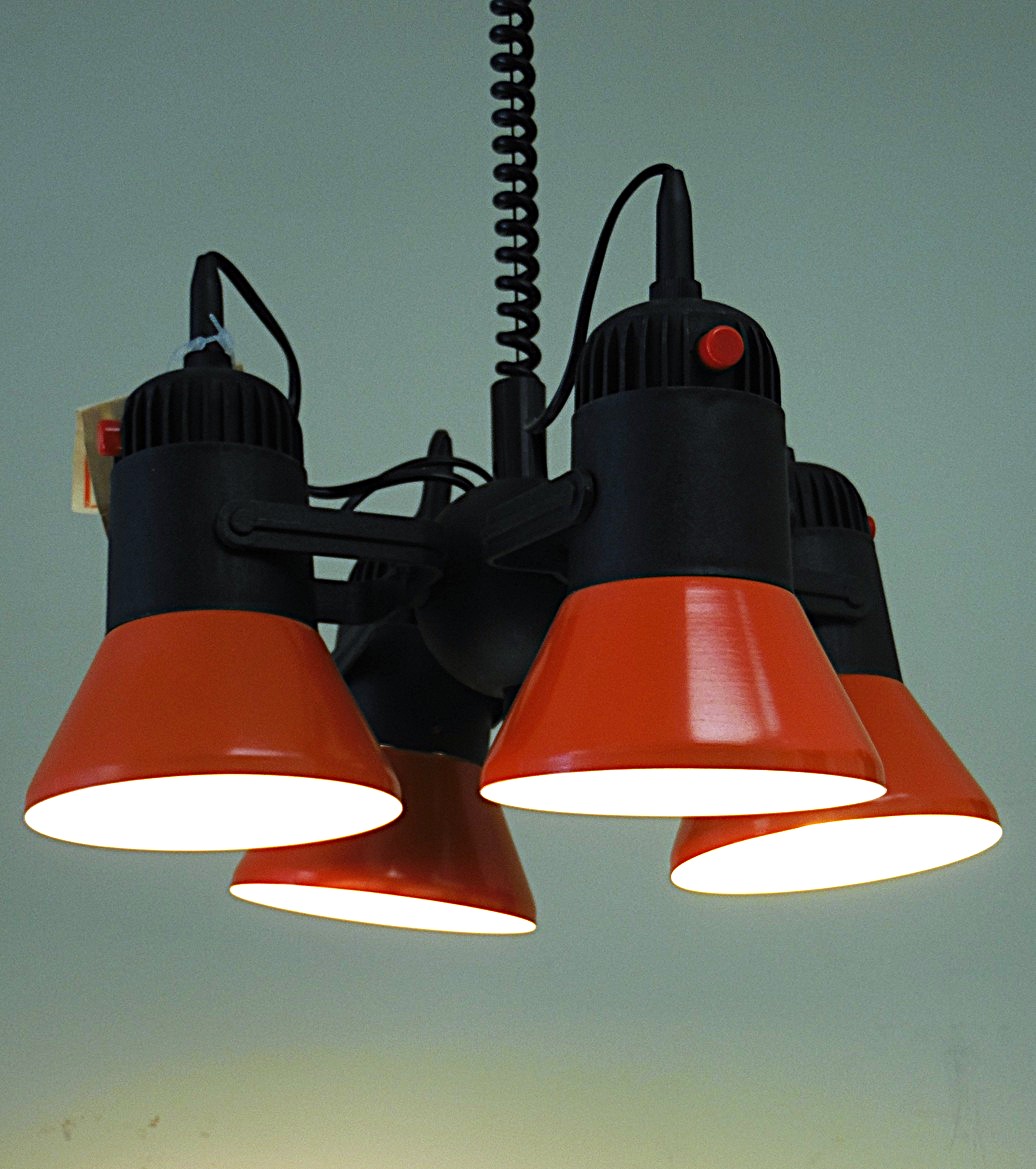 Vintage Space Age 4-spot light, adjustable lift on the light, each spot can be turned on and off separately, color orange/black, made in 1989 in the Polam-Pila factory in Poland. In absolutely perfect condition and working order, taken out of the original packaging for photography, original paper labels still intact showing both the manufacturing and sale dates;