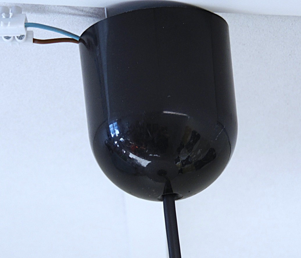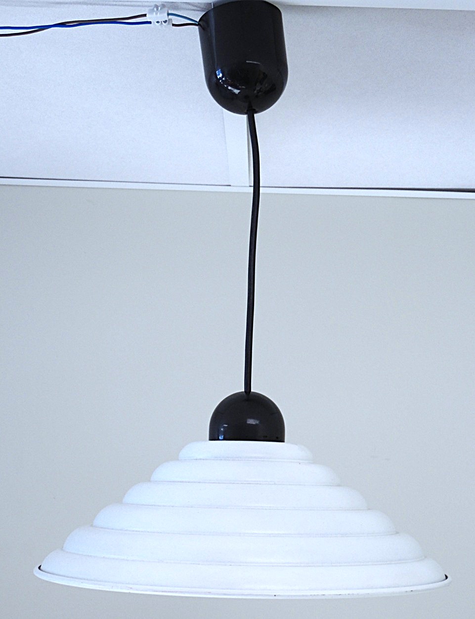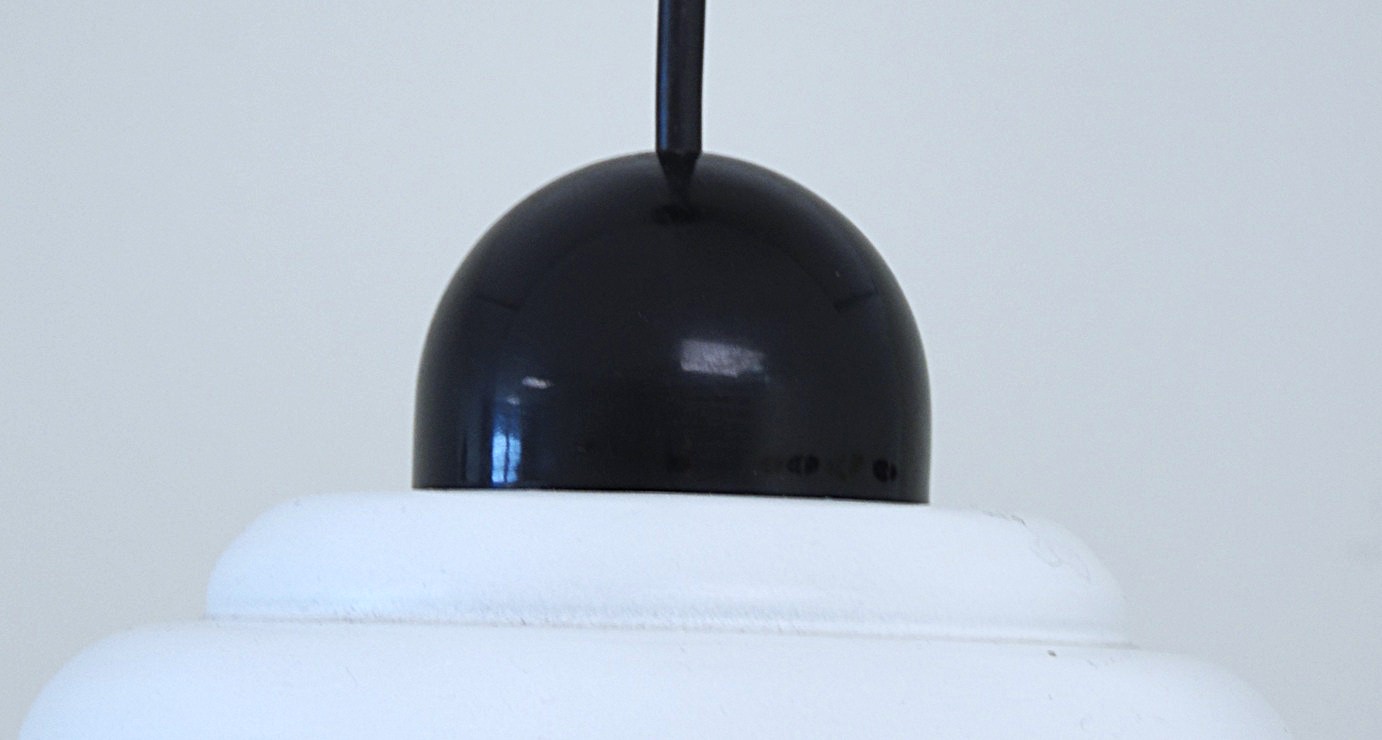 Vintage Space Age ceiling lamp “UFO”, metal dome, black/white color, dome diameter 31 cm, 1970’s/80’s design, made in France, fully functional but has scratches and signs of use due to age;