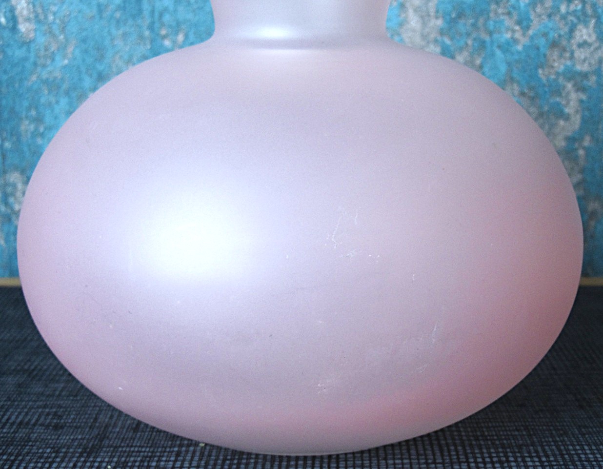 Vintage style Peony Bud Vase Verre d’Onge, Hand blown pink glass vase in a signature matte sandblasted finish, dimensions: height 15 cm, diameter 17.5 cm, in good condition but with minimal signs of wear consistent with age; The flowers in the pictures are not part of the sale and do not come with the purchase!